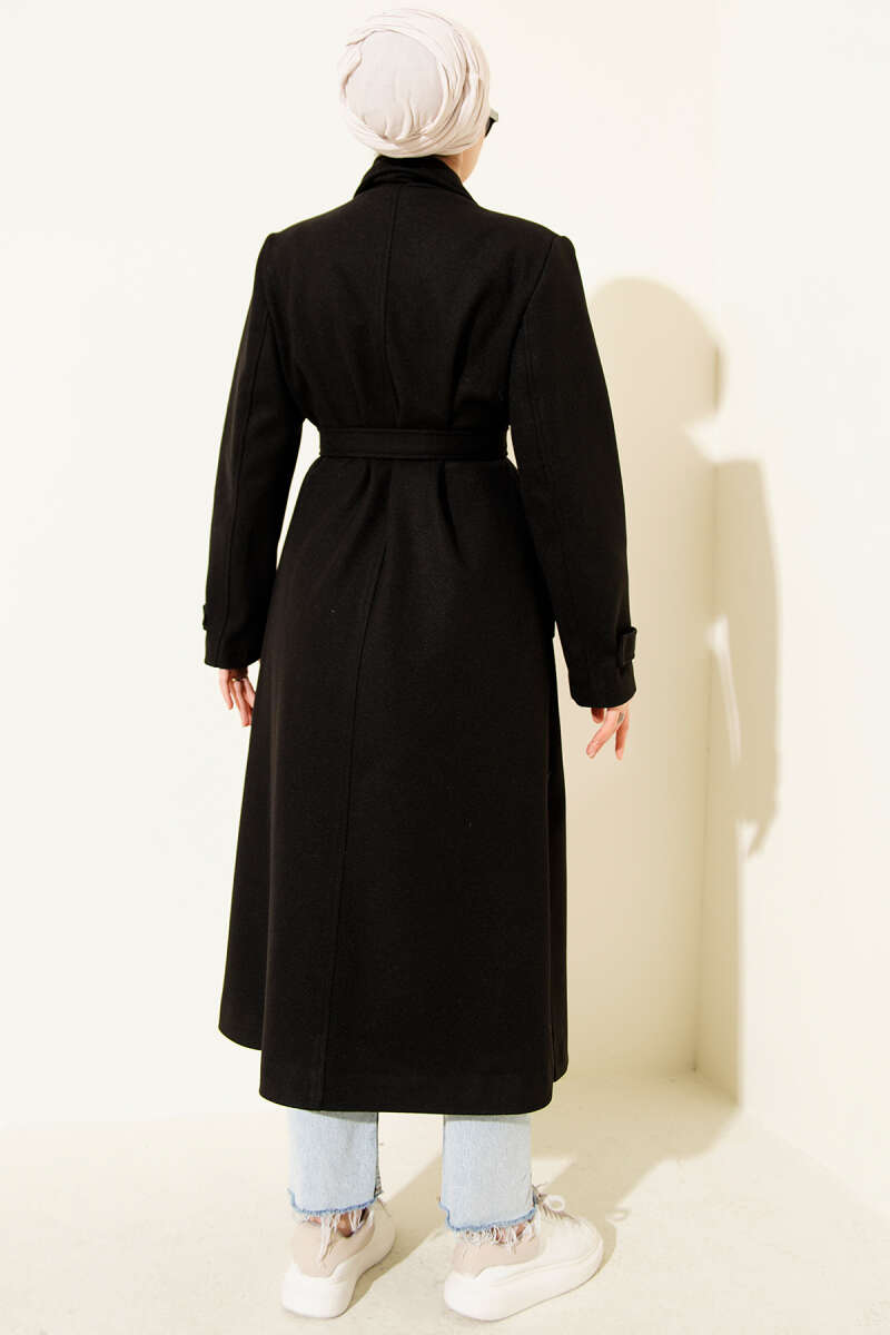 Omuz Apoletli Düğme Detaylı Kaşe Kaban Siyah
