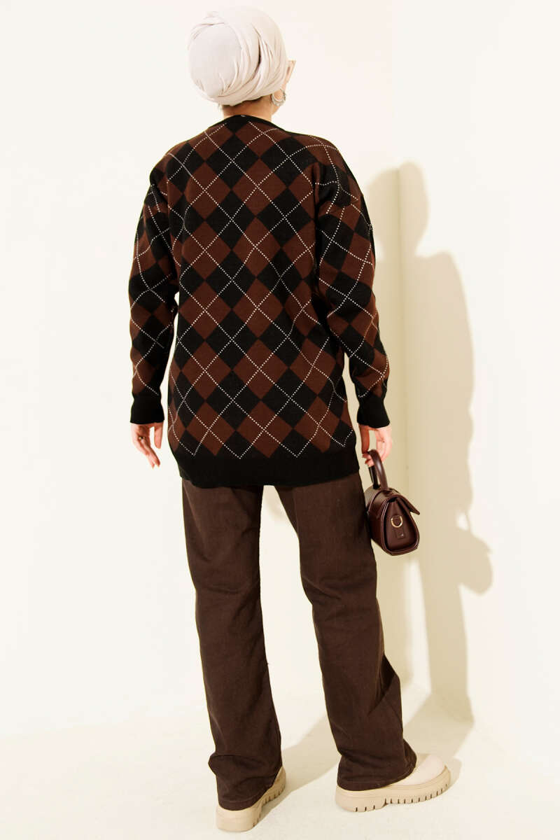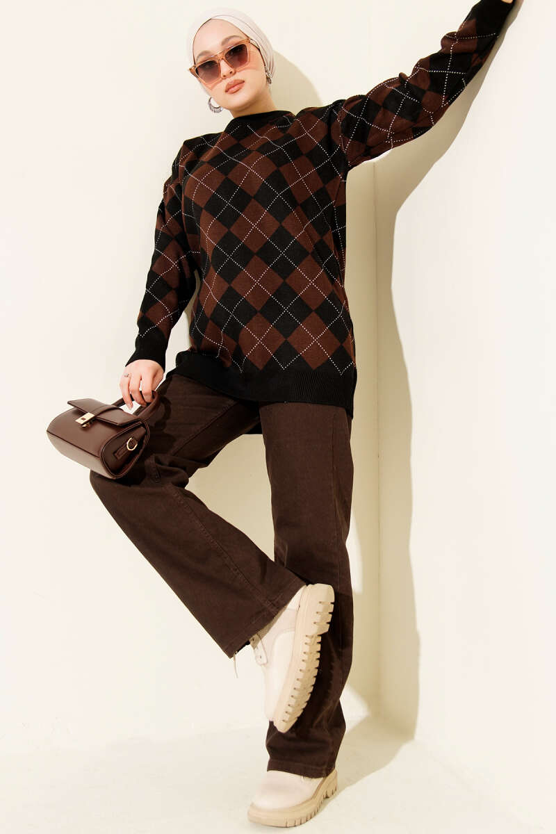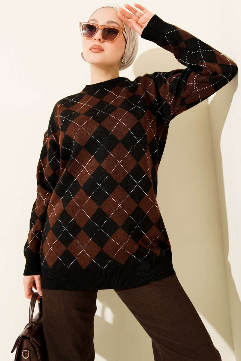 Küçük Baklava Desenli Triko Tunik Kahve