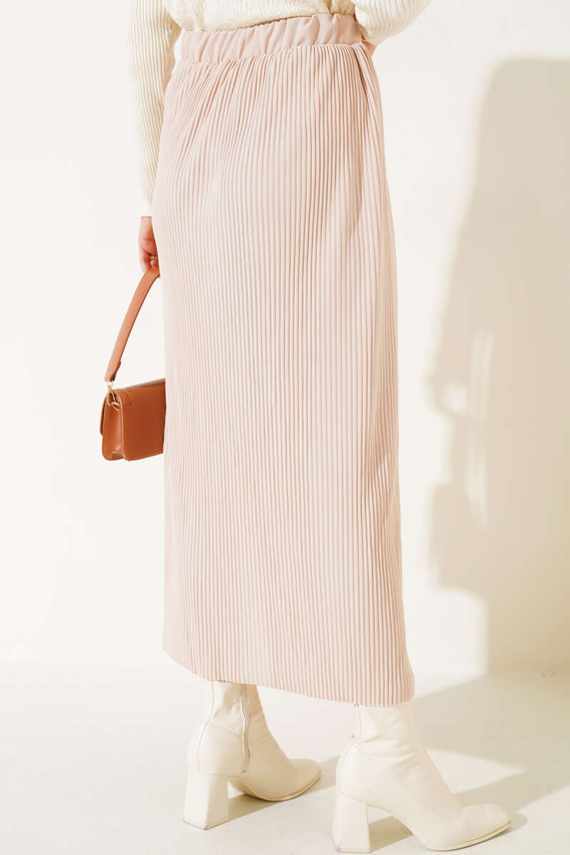 Kumaşı Piliseli Kalem Etek Bej