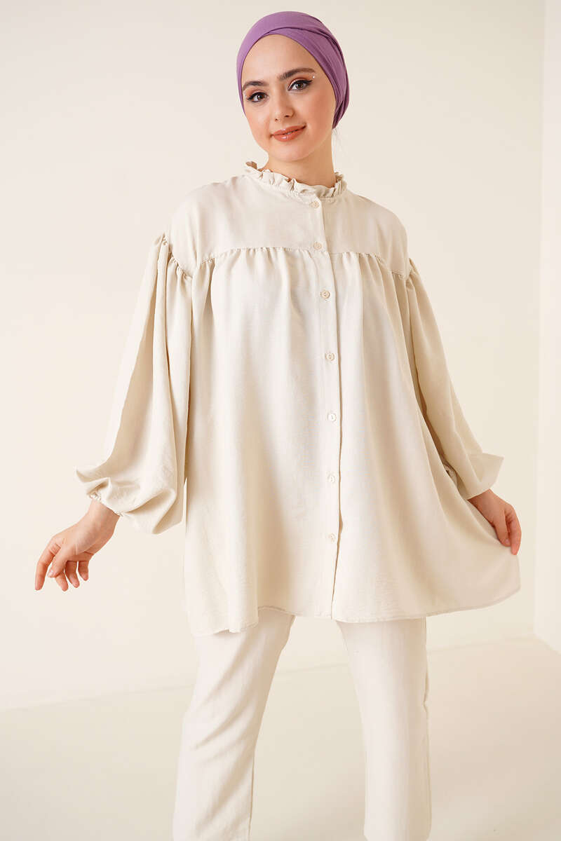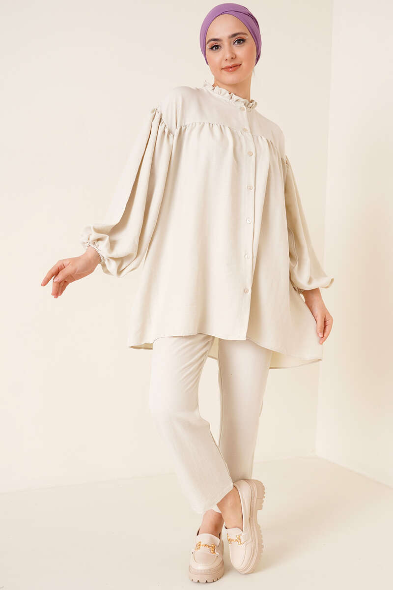 Yeni sezon ikili takımımız tunik ve pantolondan oluşmaktadır. İkili takımımızın tuniği düğmelidir. Bilekleri lastiklidir. Omuzlarının büzgülü yapısıyla ikili takımımız hem hareket kazanmıştır hem de şık bir görünüm sunmuştır. Düşük omuz model olan tuniğimiz fırfırlı yakadır. İkiili takımımızn pantolonu iki ceplidir. Beli lastikli olan pantolonumuz bol paçadır.