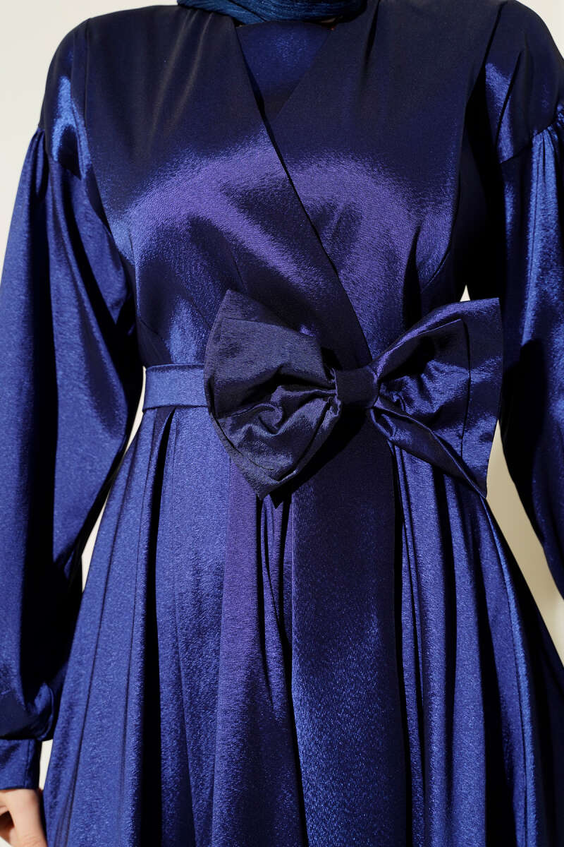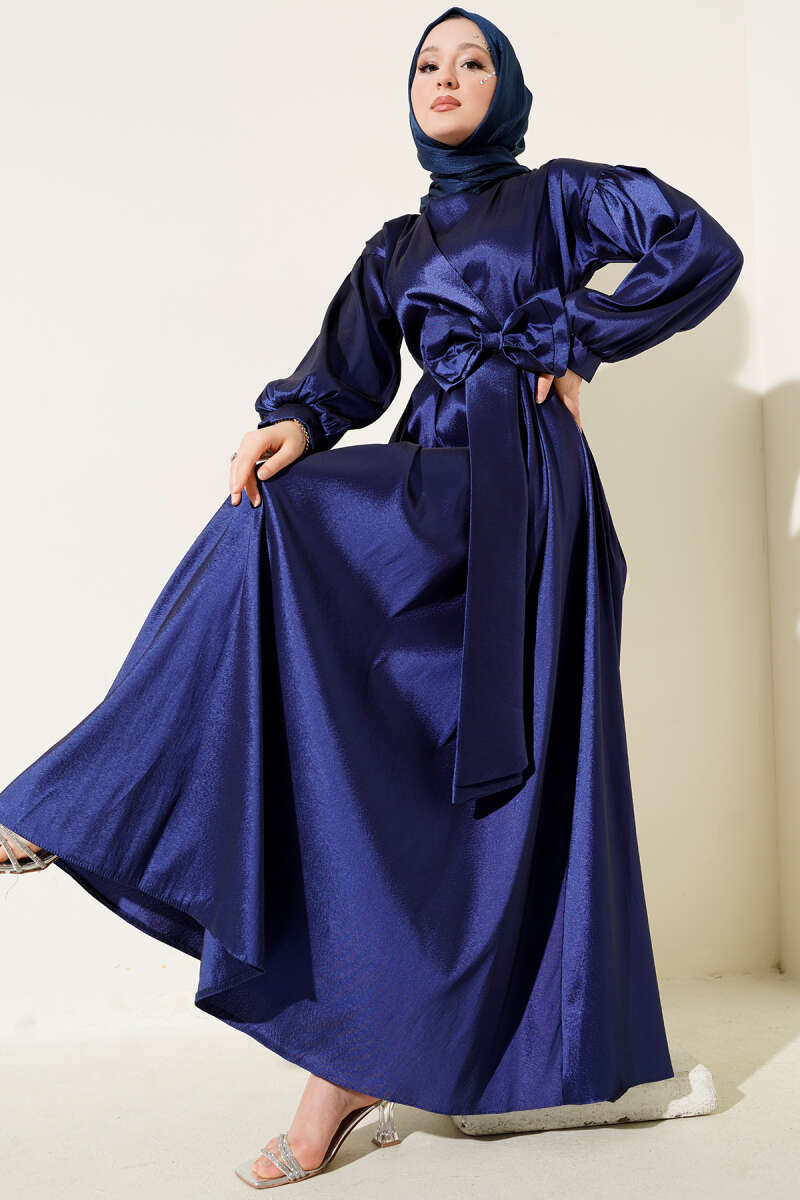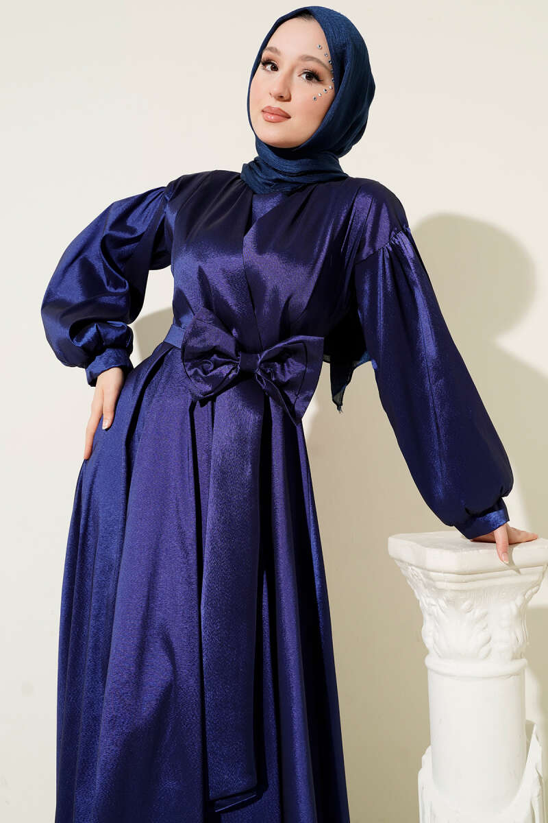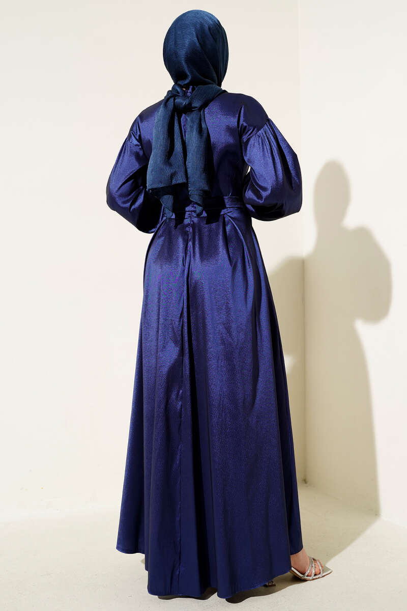 Büzgü Detaylı Simli Abiye Elbise Lacivert