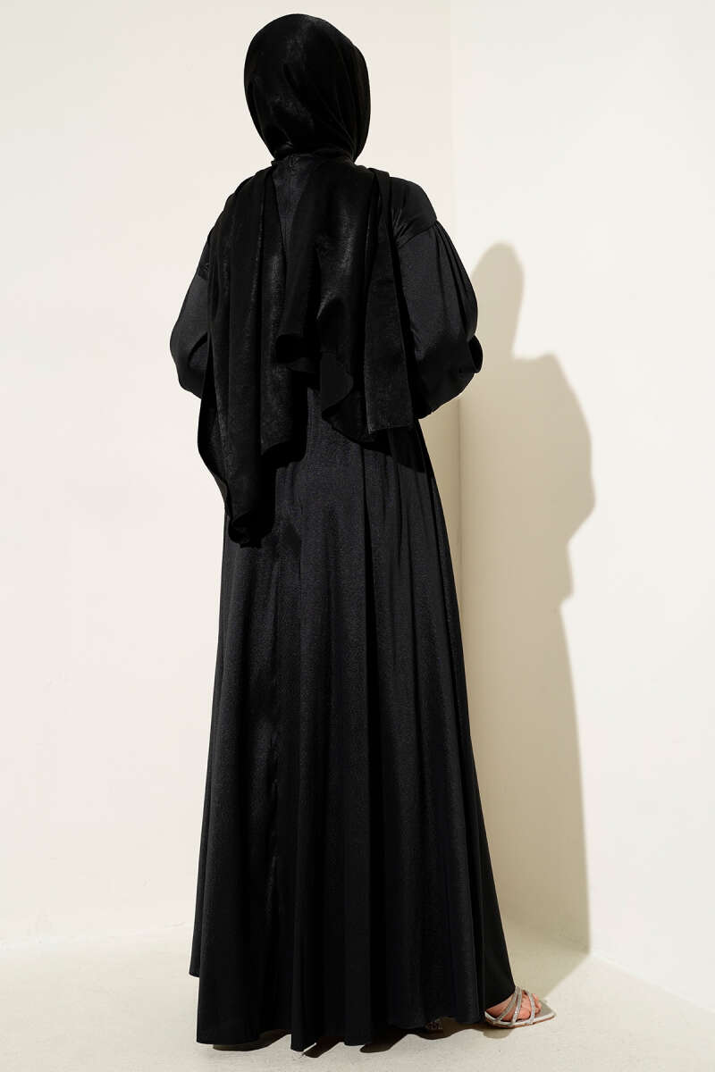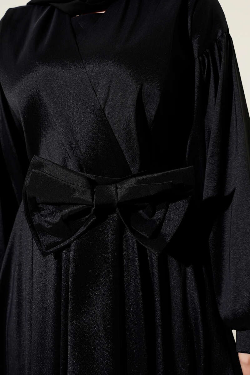 Metal Düğme Süslemeli Bağcıklı Elbise Siyah