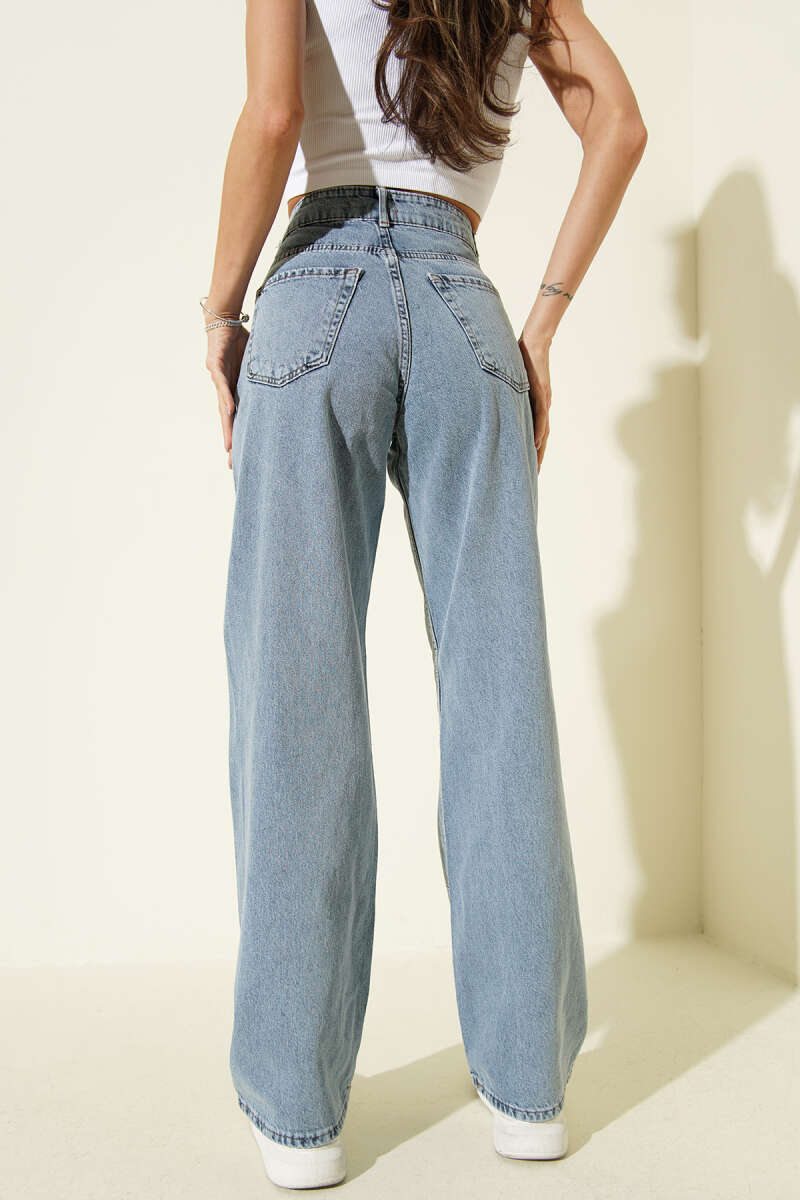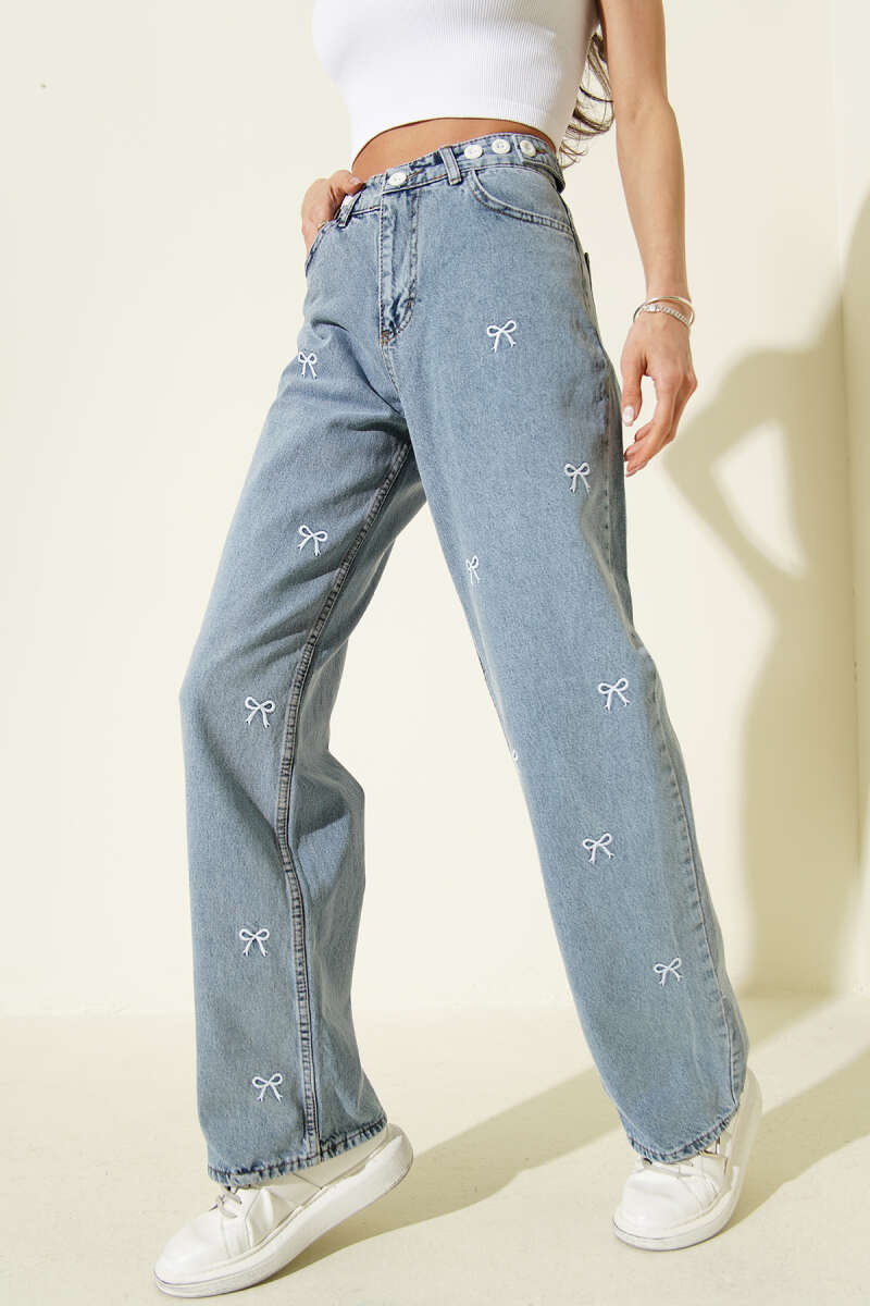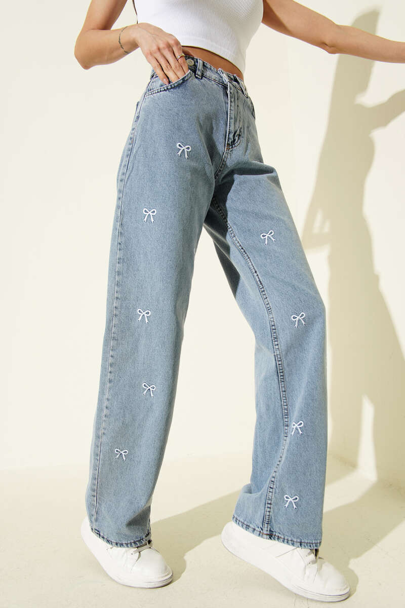 Kurdele Nakışlı Palazzo Kot Pantolon Açık Mavi