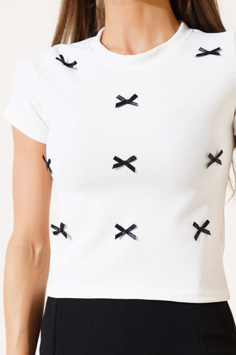 Kurdele Süslemeli Kısa Kol Crop Beyaz