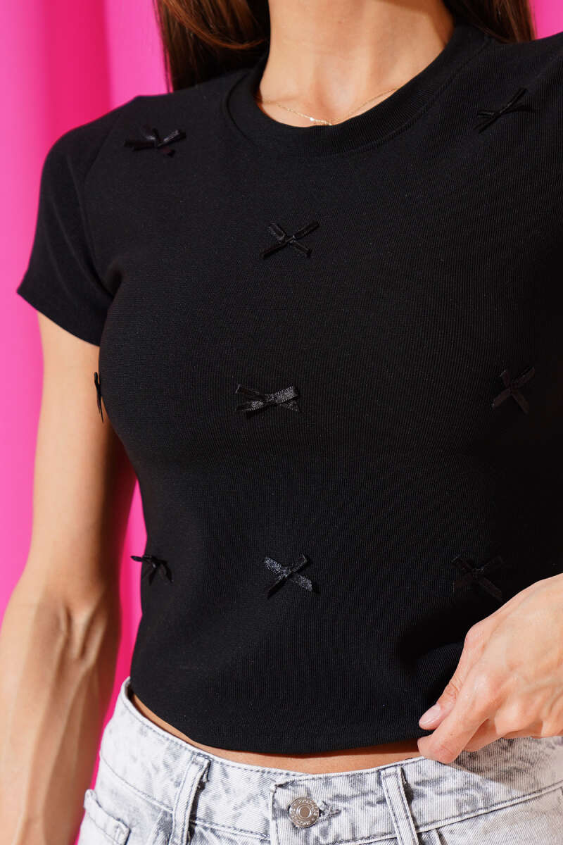 Kurdele Süslemeli Kısa Kol Crop Siyah
