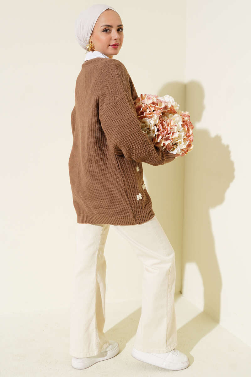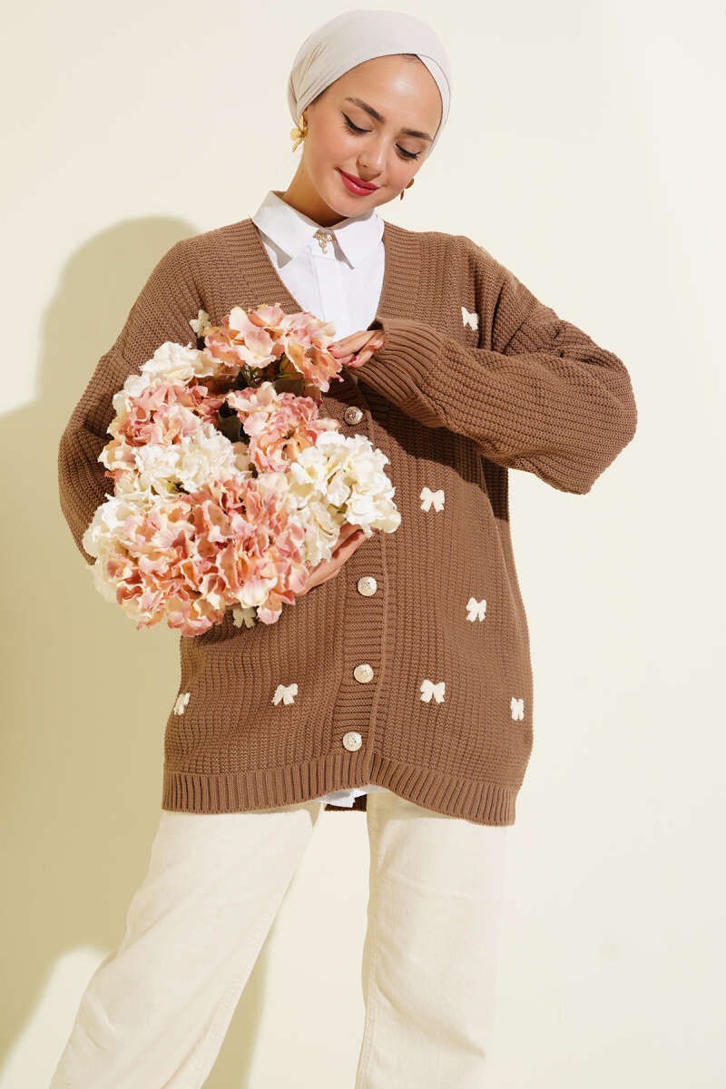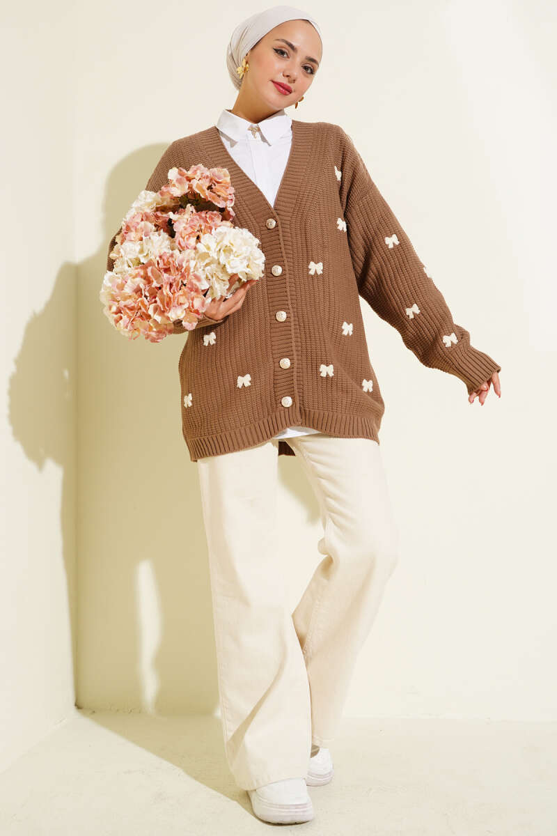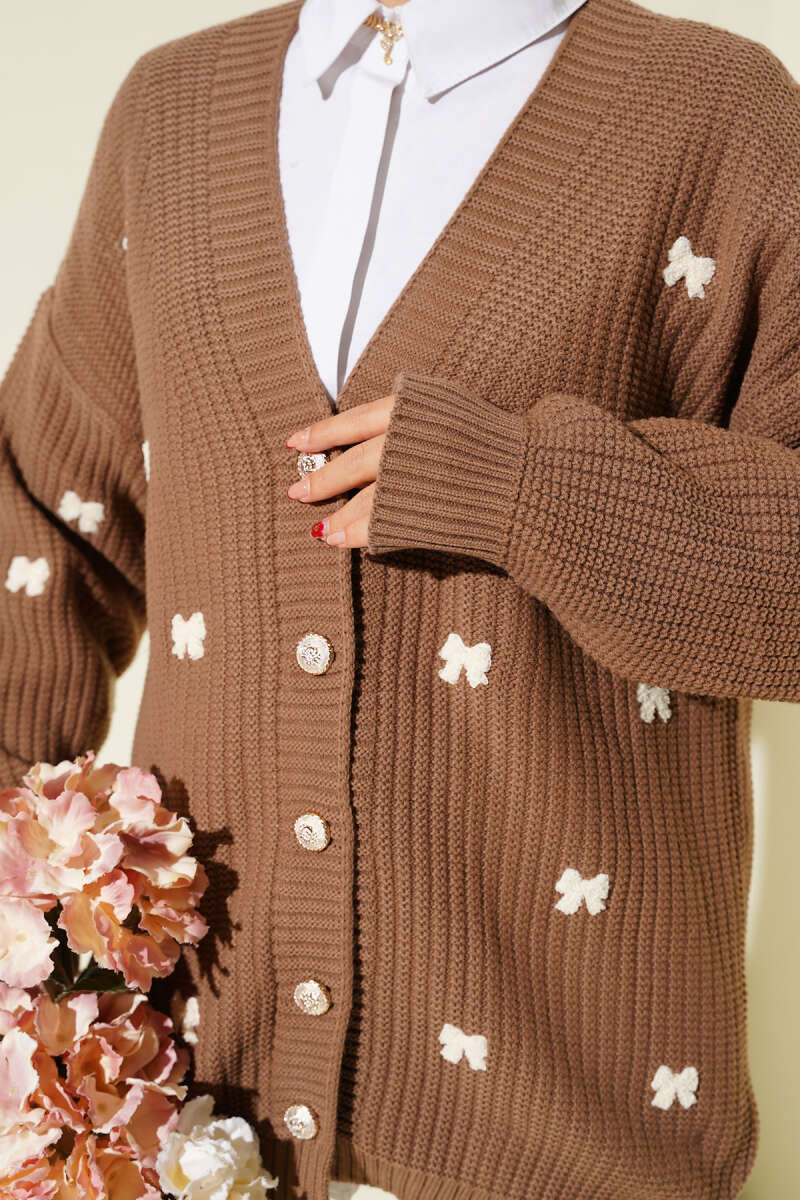 Kurdele Süslemeli Triko Hırka Bej
