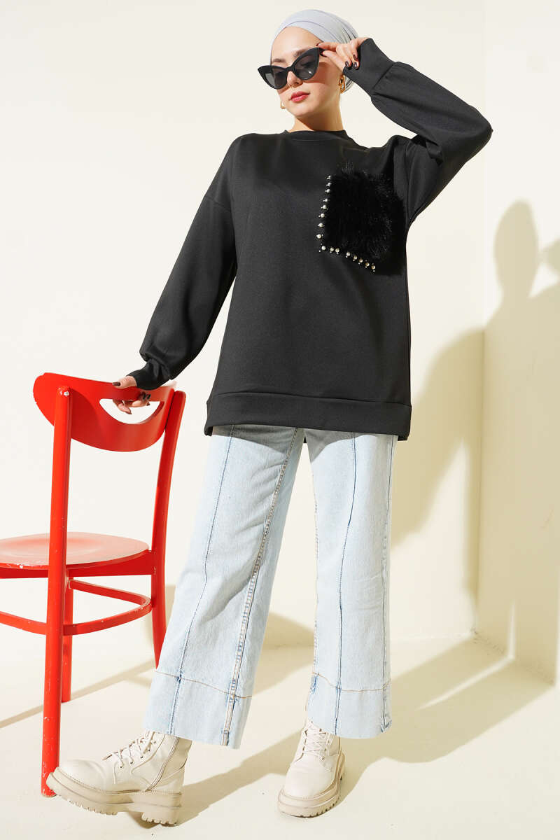 Yatay Çizgi Detaylı Triko Tunik Siyah