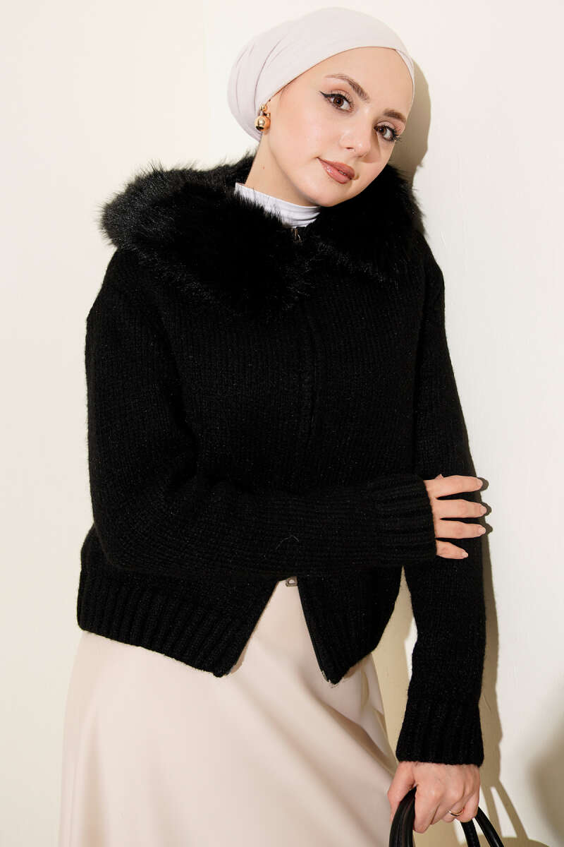 Yakası Kürklü Triko Kısa Hırka Kahve