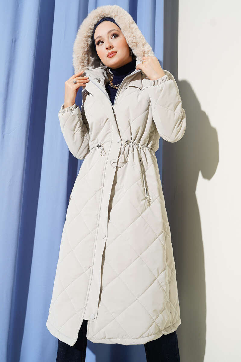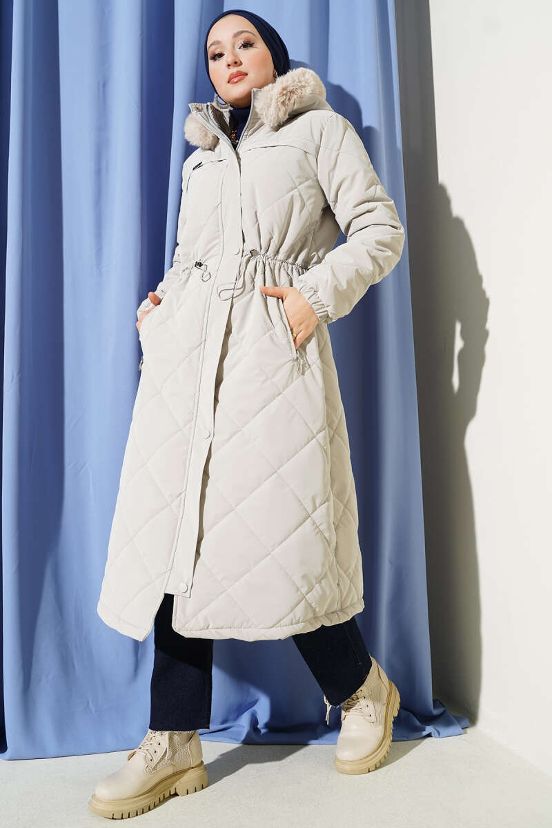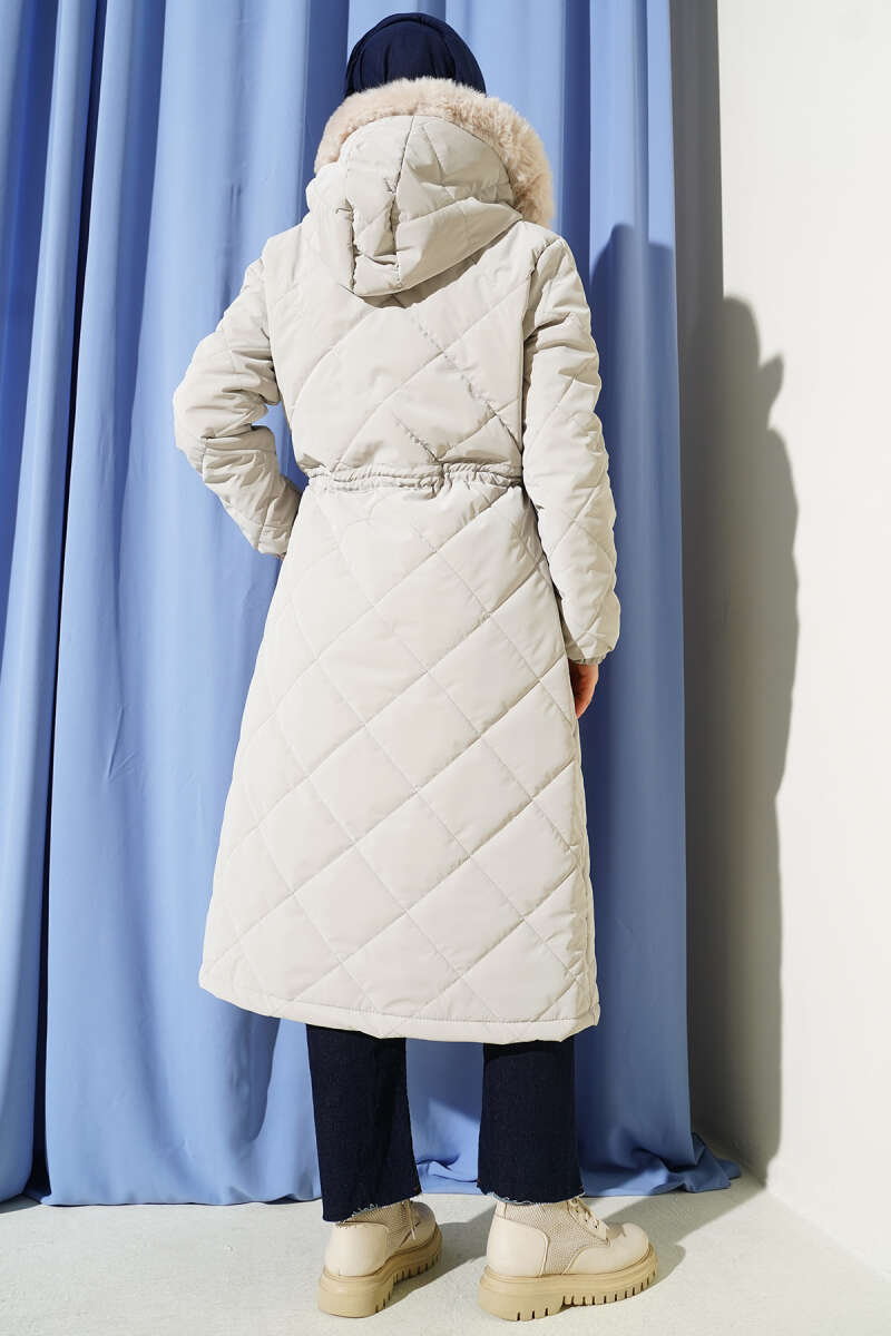 Kürk Kapüşonlu Kapitone Uzun Mont Gri