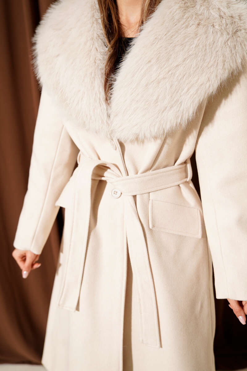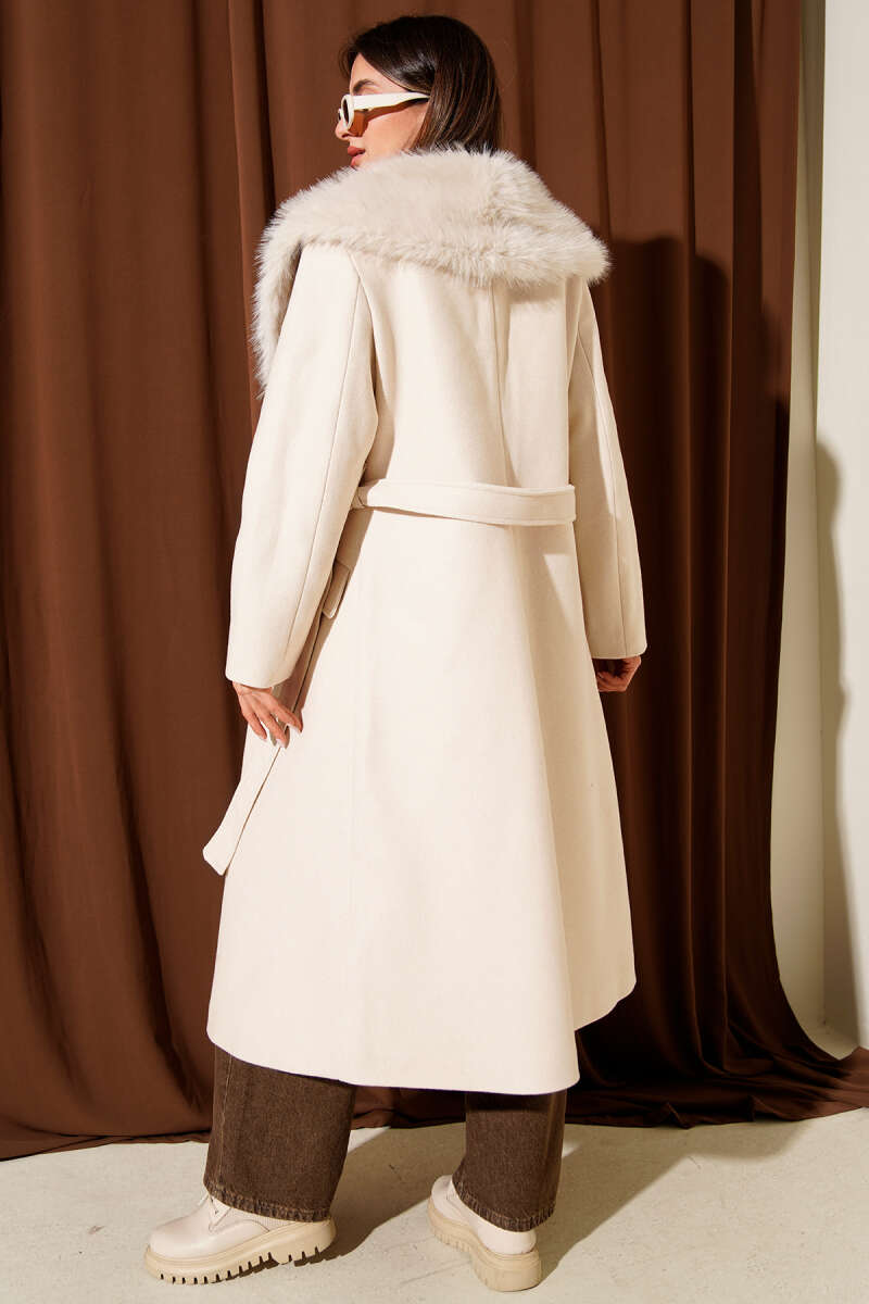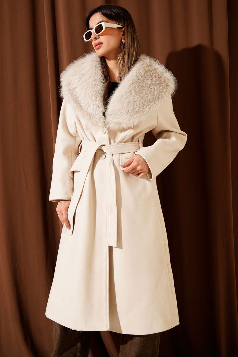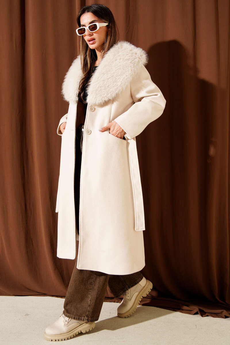 Kuşaklı Rüzgarlıklı Uzun Kaşe Kaban Ekru