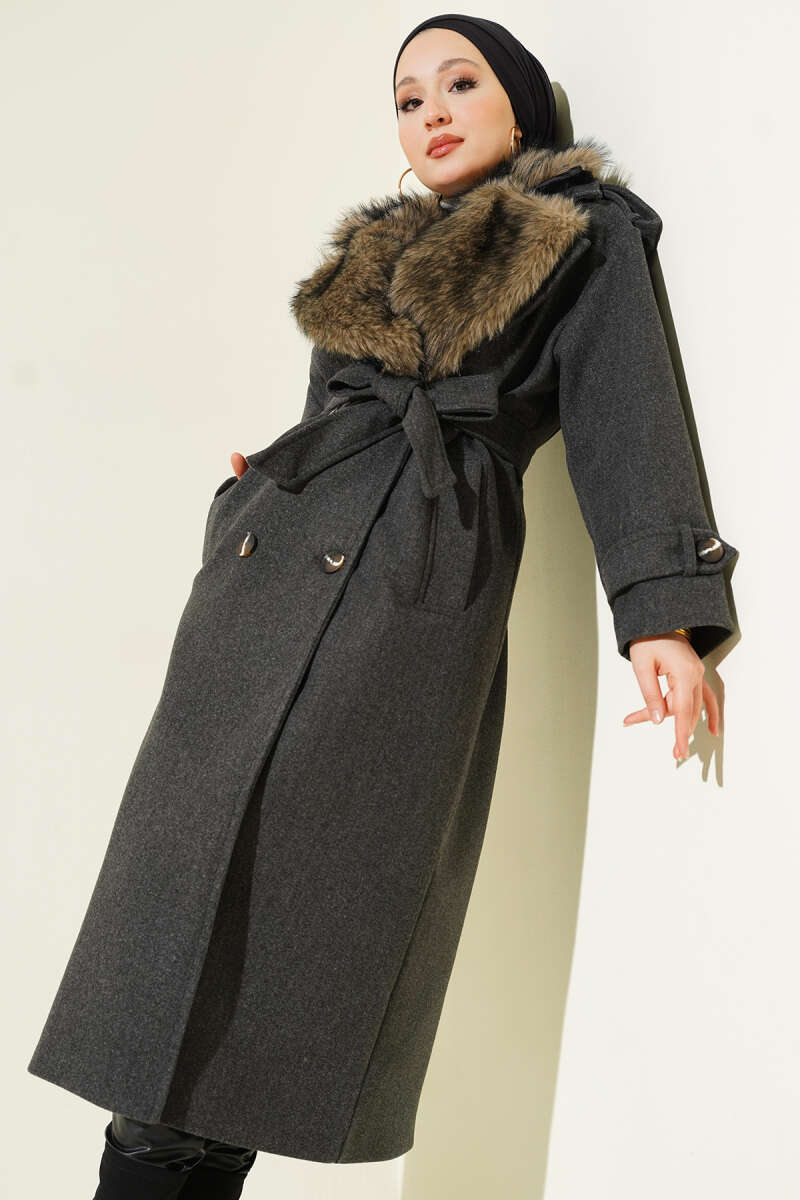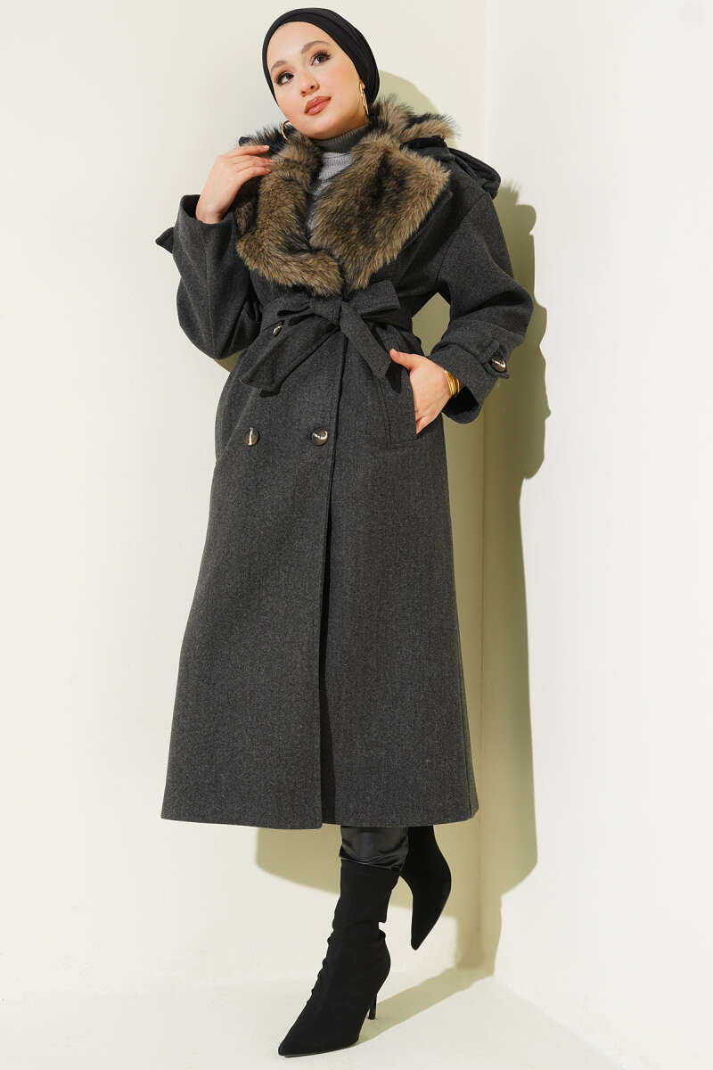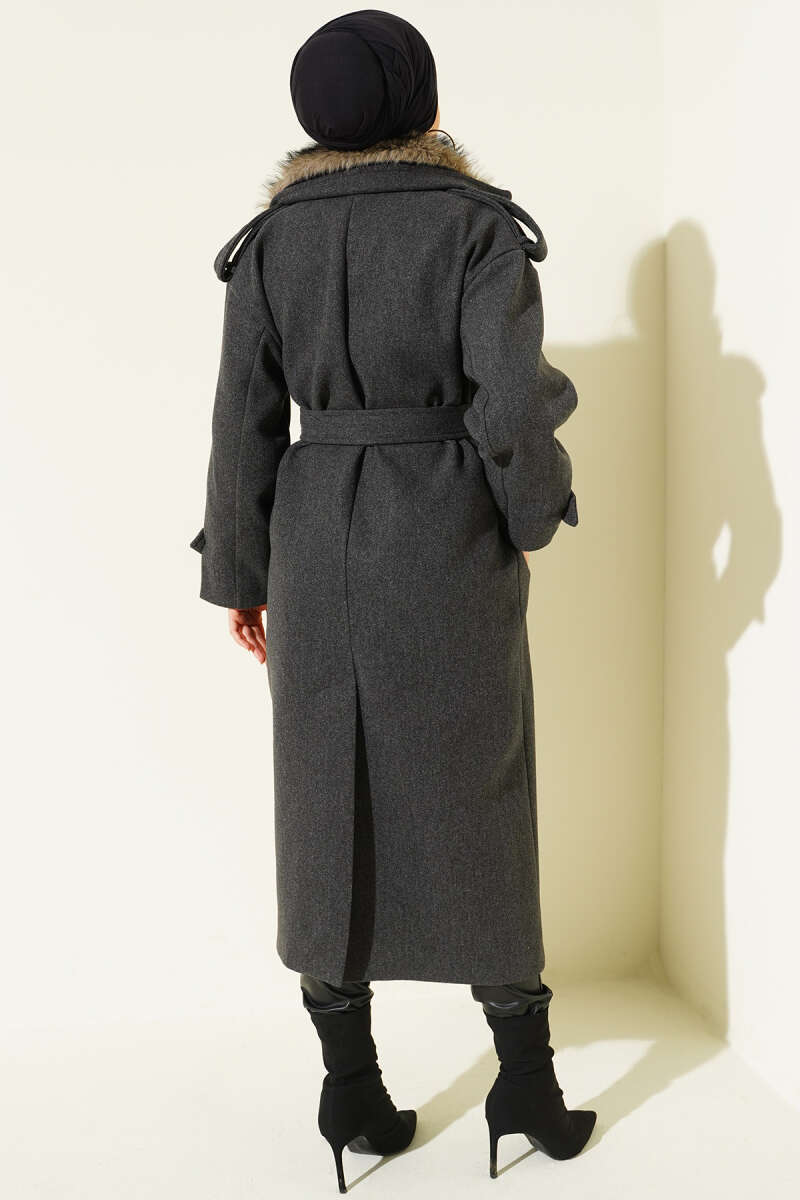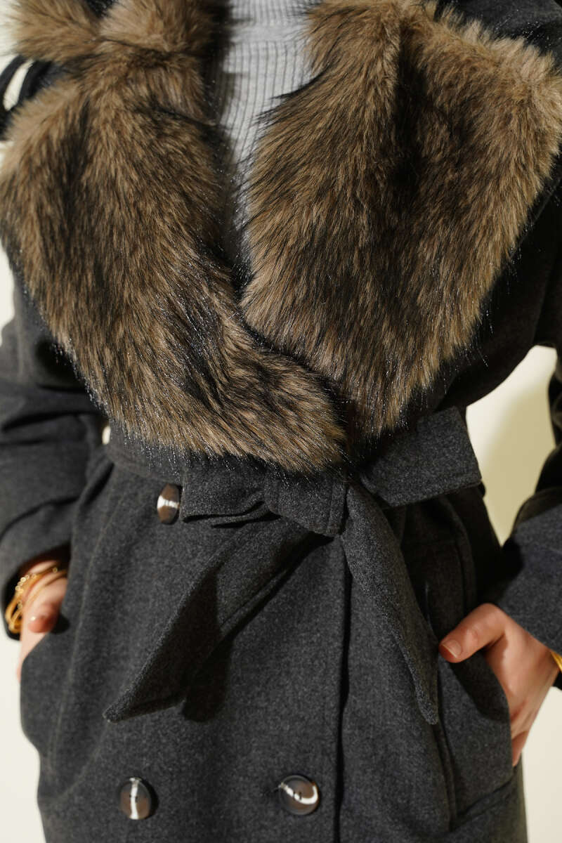 Bilek Kürklü Kuşaklı Goldfox Kaban Gri