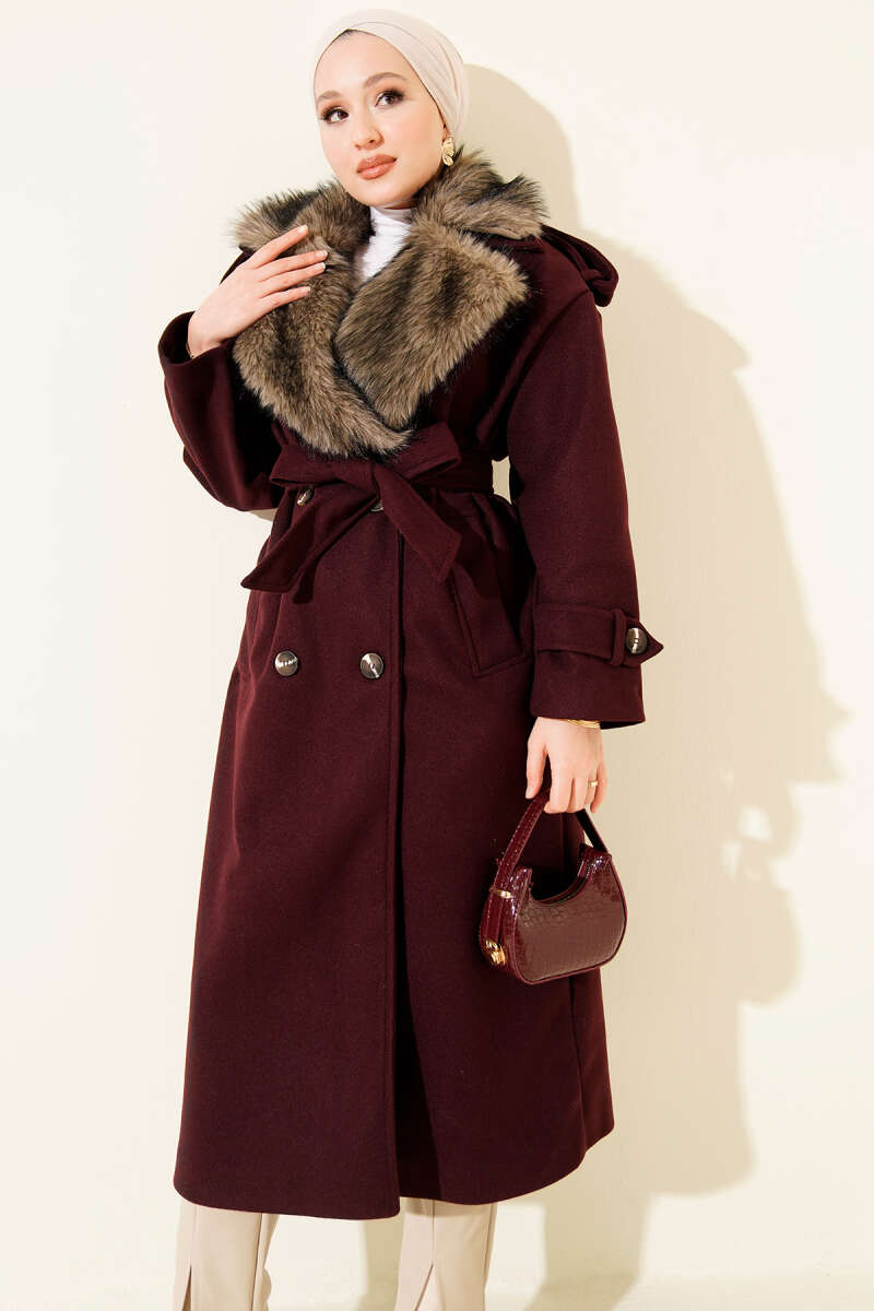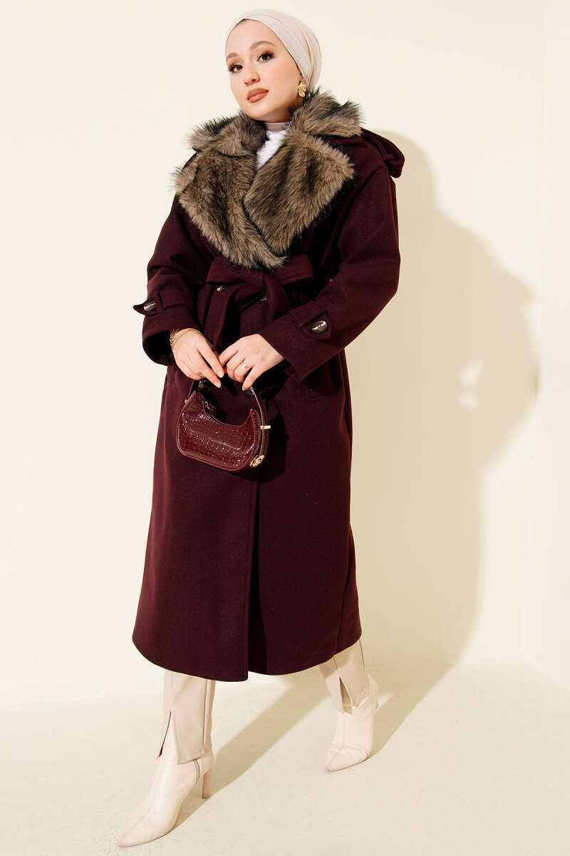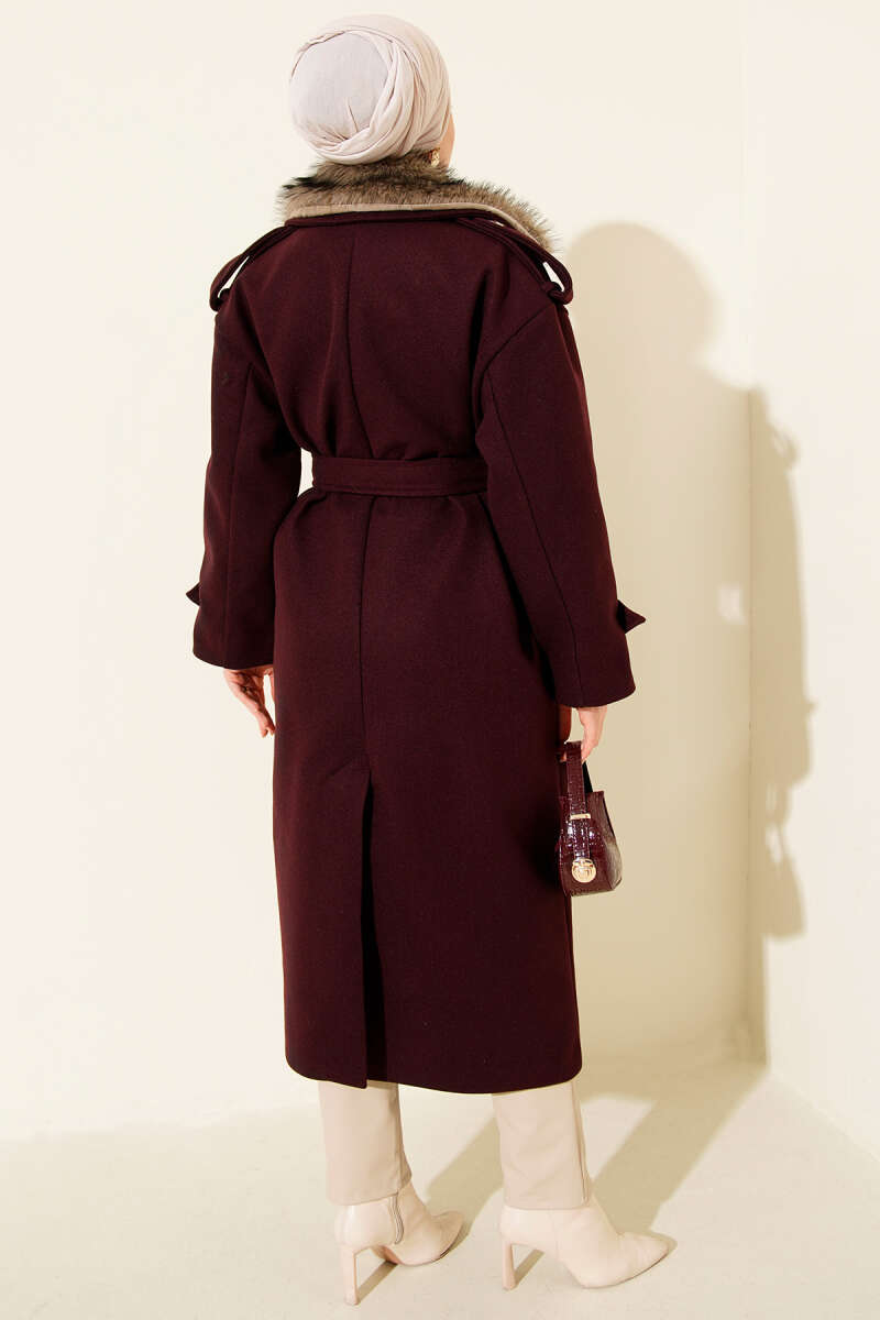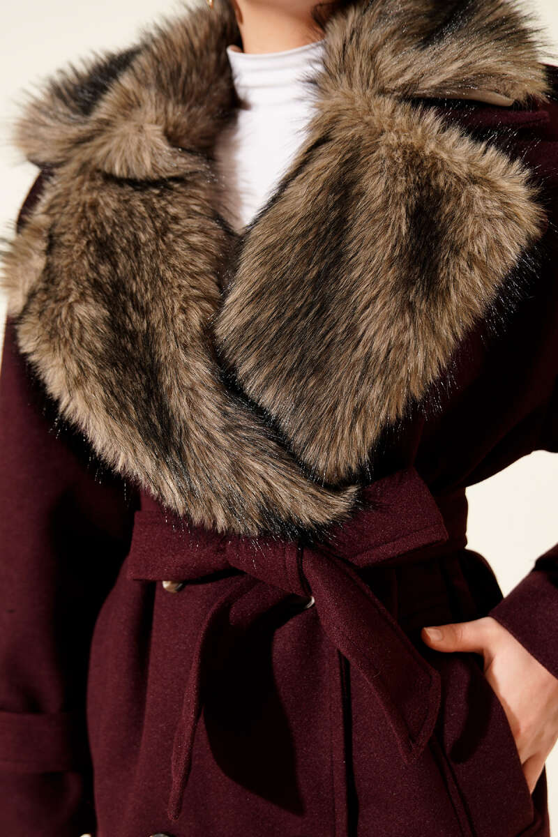 Kürk Yakalı Düğmeli Kaşe Kaban Mürdüm