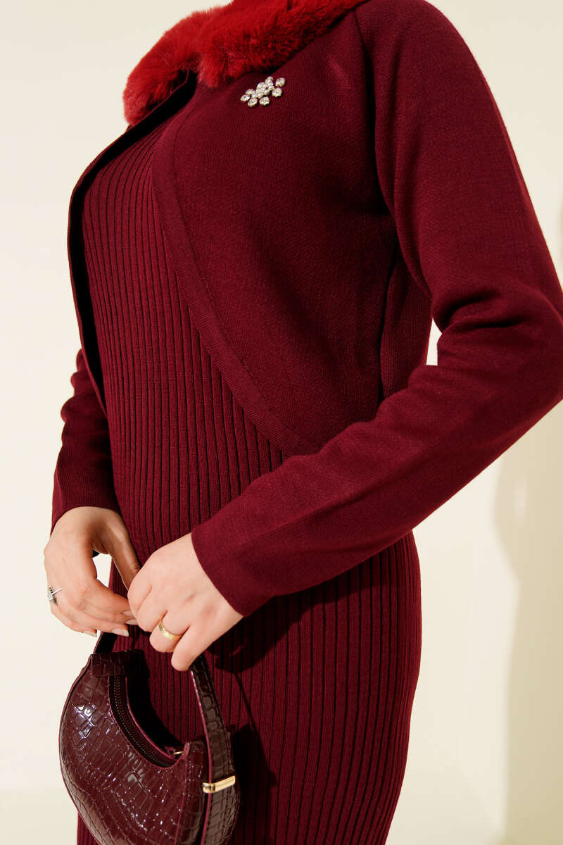 Kürklü Detaylı Jile Triko Elbise Bordo