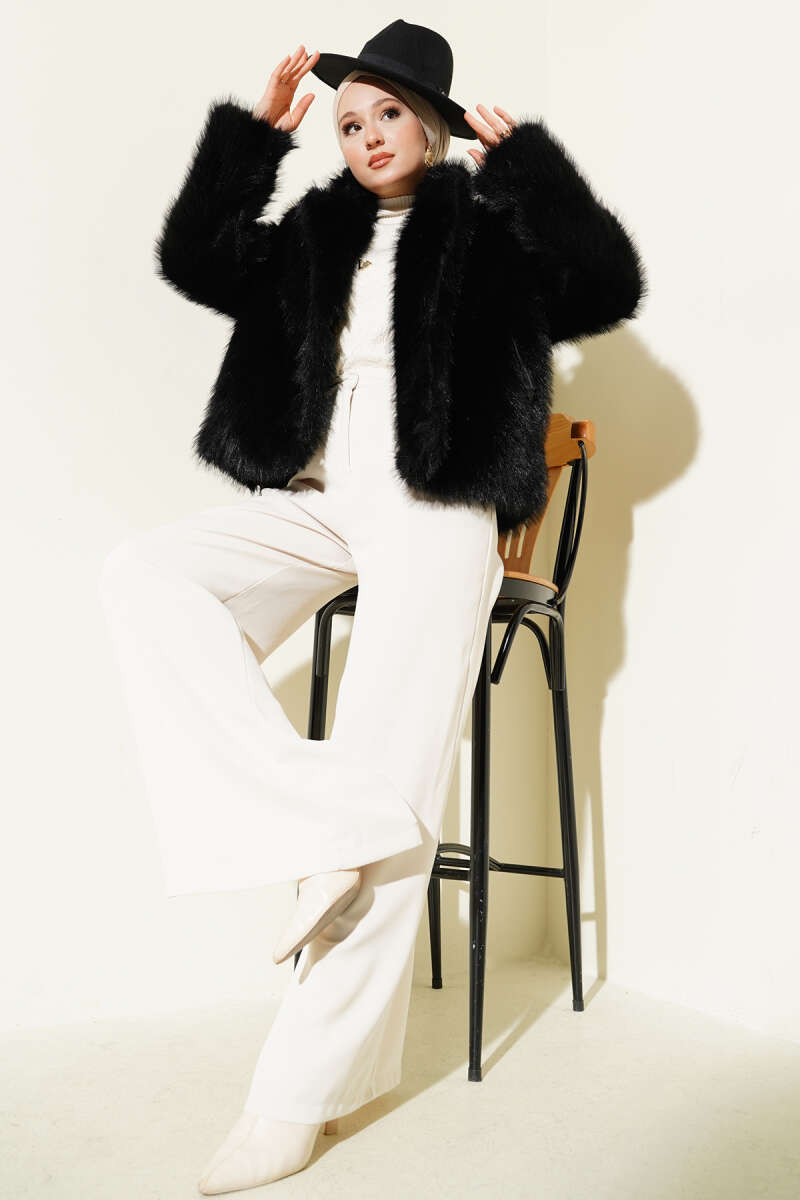 Peluş Garnili Oversize Mont Siyah
