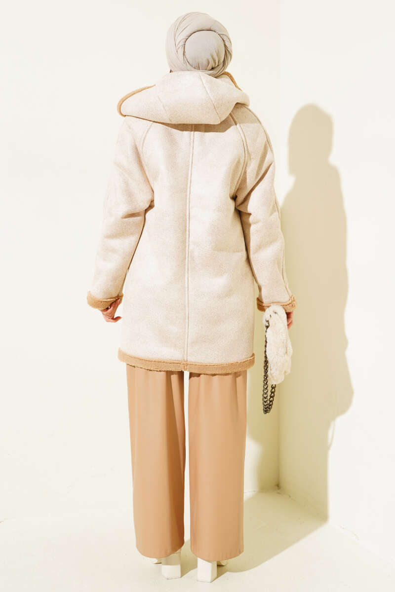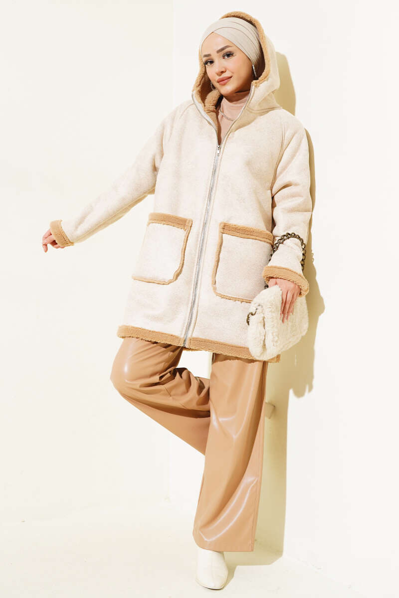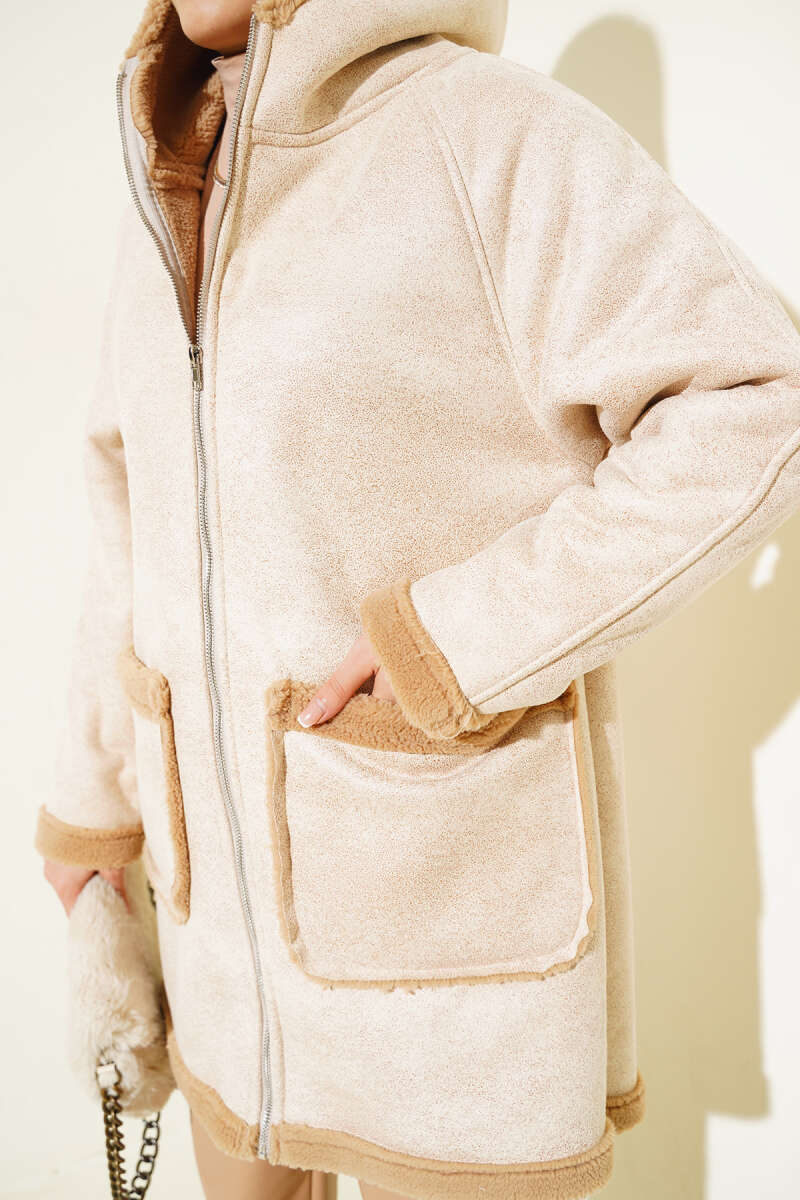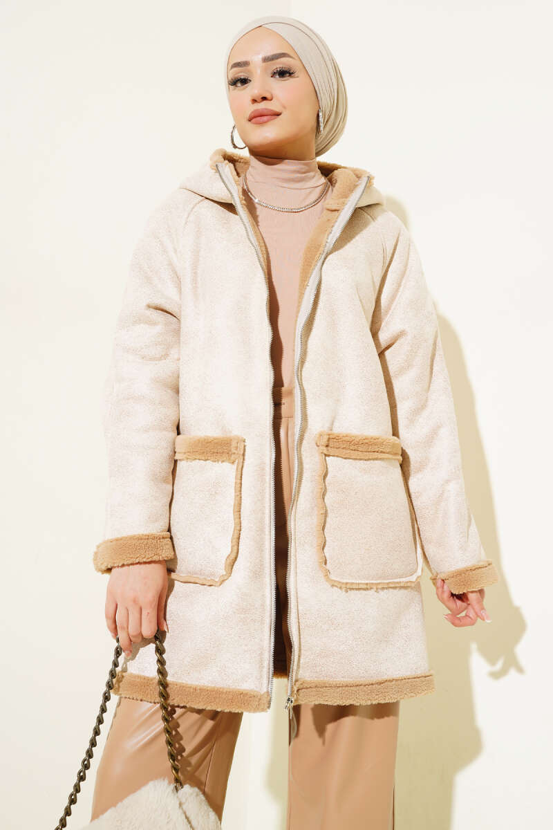 Kürklü Fermuarlı Kapüşonlu Mont Bej