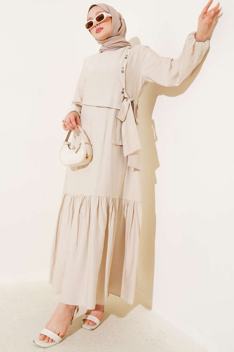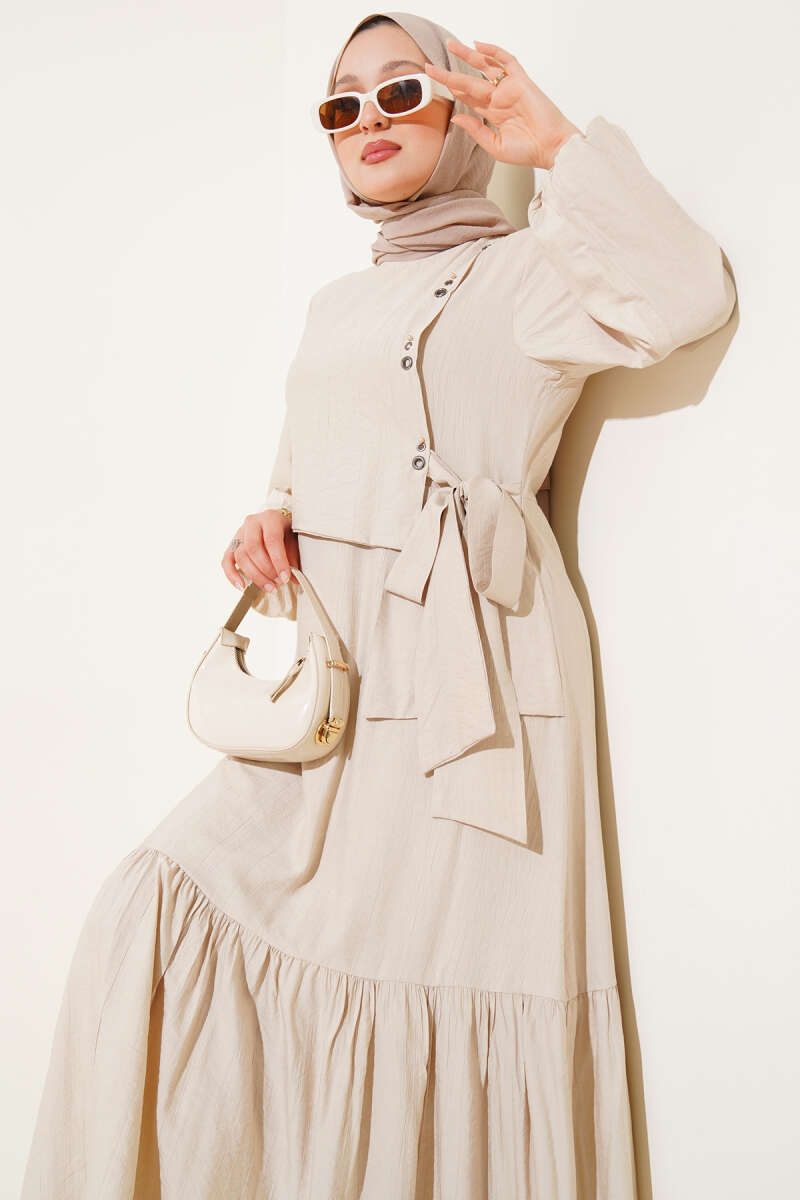 Bel Tünelli Düğmeli Ağaç Kabuğu Elbise Çağla Yeşili
