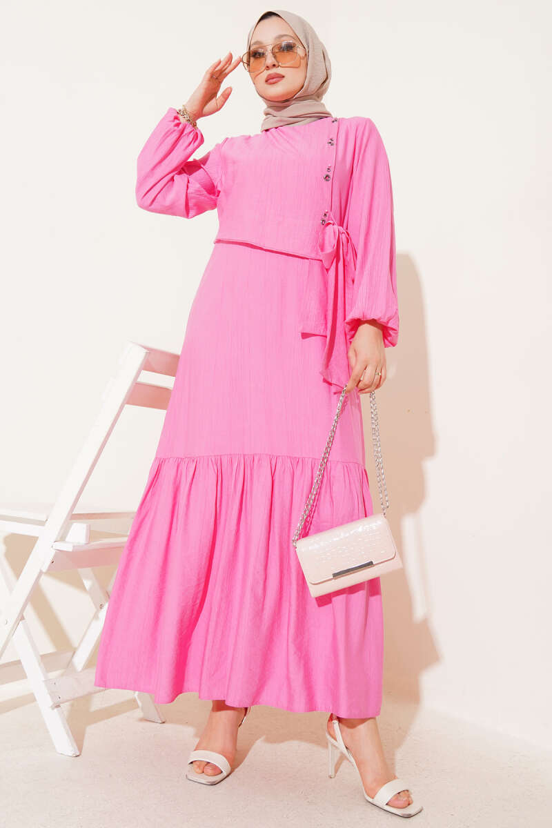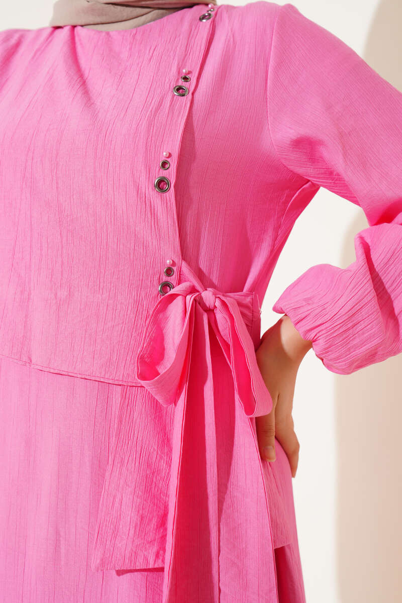 Bel Tünelli Düğmeli Ağaç Kabuğu Elbise Çağla Yeşili