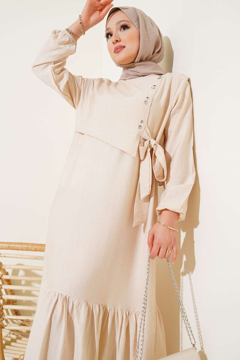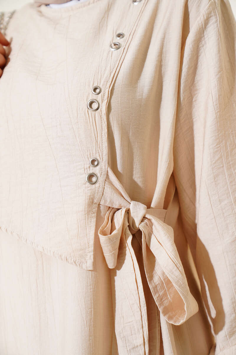Scuba Pens Detaylı Kemerli Elbise Ekru