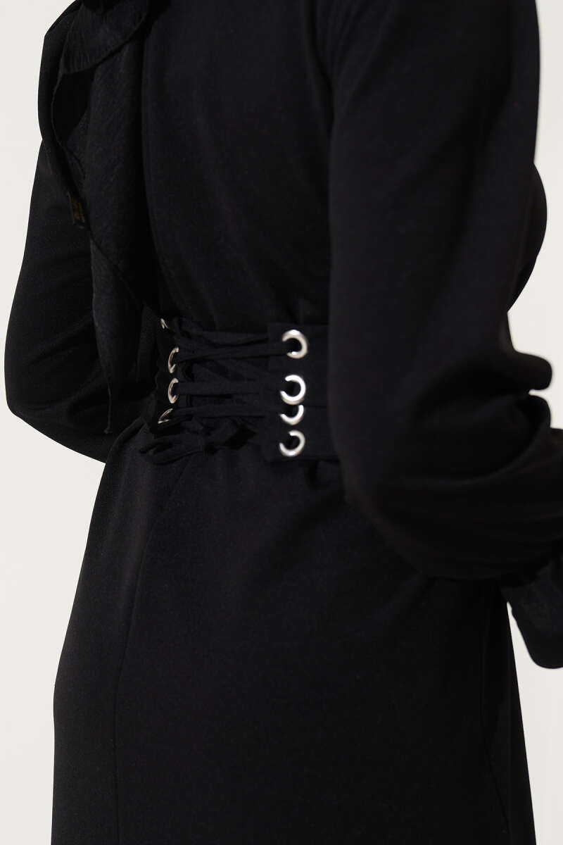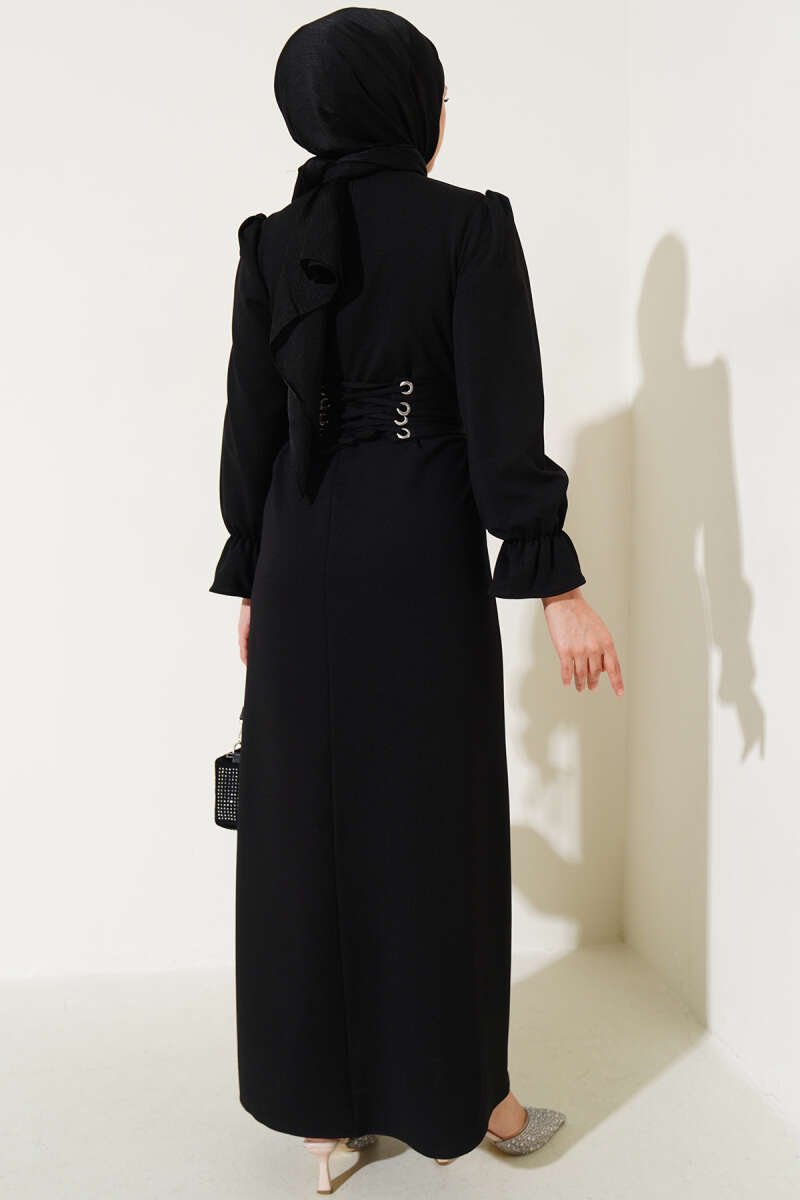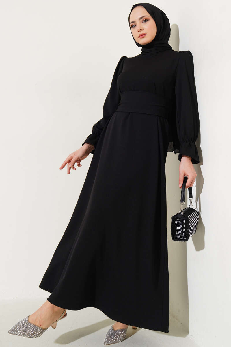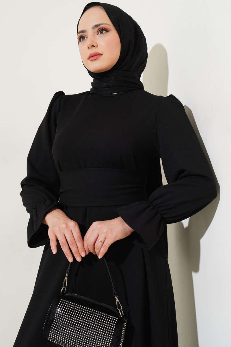 Kolları Fiyonk Detaylı Selanik Elbise Siyah
