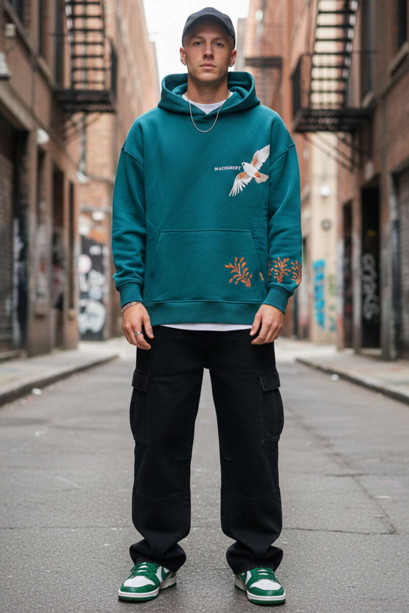 Yırtık Efektli Nakışlı Erkek Sweatshirt Petrol