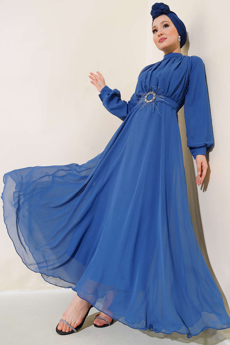 Yeni sezon şifon elbisemiz şık davetlerde ve özel gecelerde ışıldamanız için tasarlandı. Kendi renginde olan kuşağı tüy detaylıdır. Manşet bilekleri düğmelidir. Hakim yaka olan elbisemizin sırtı fermuarlıdır.