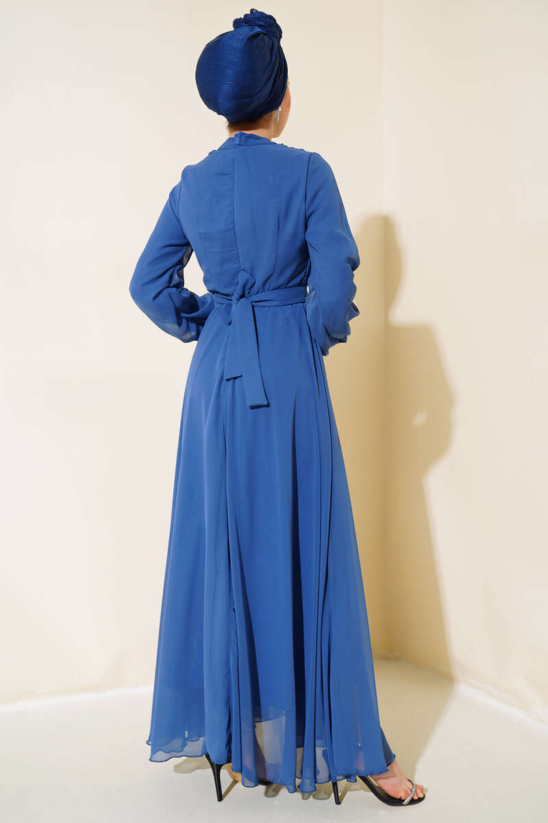 Kuşağı Tül Detaylı Şifon Elbise İndigo