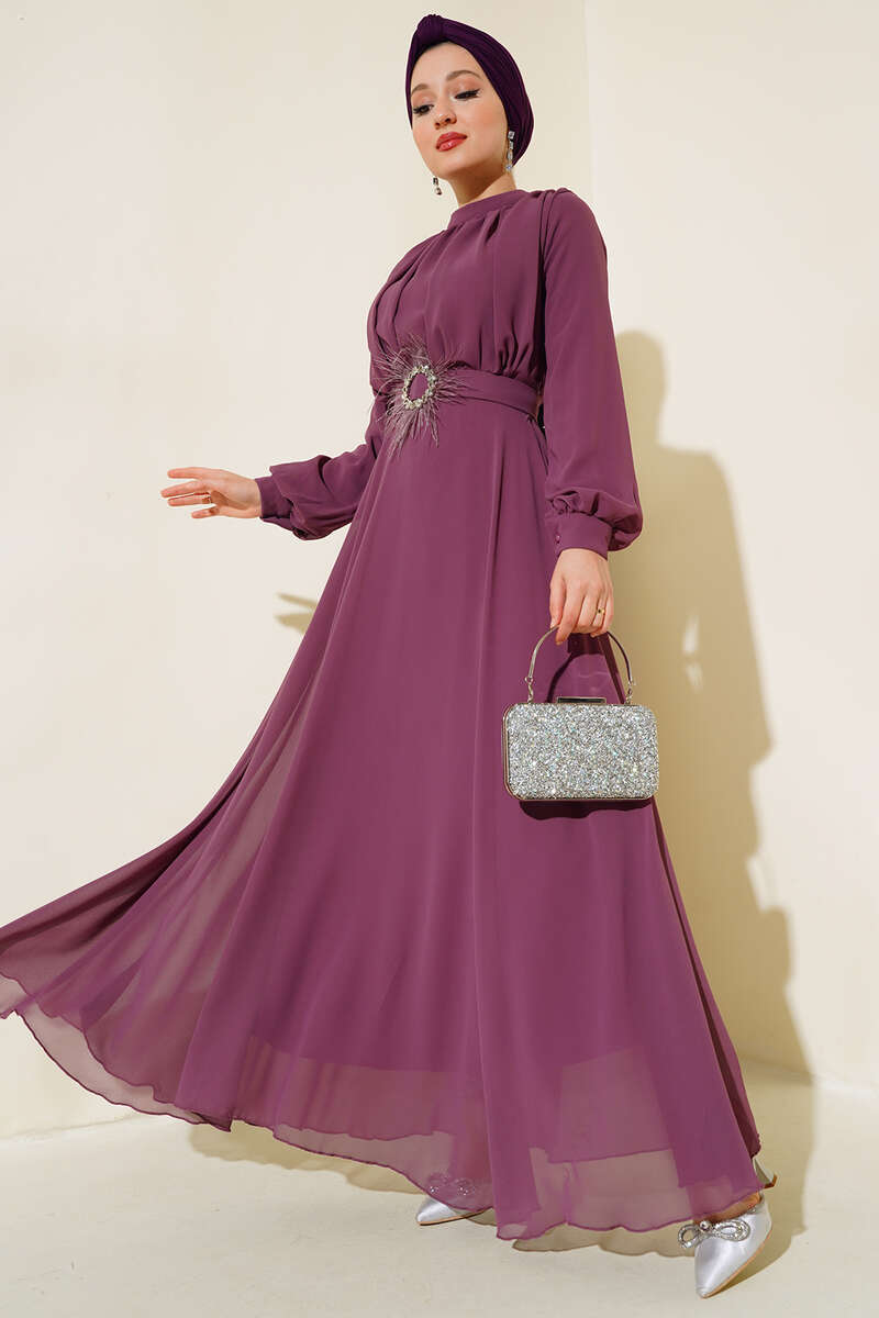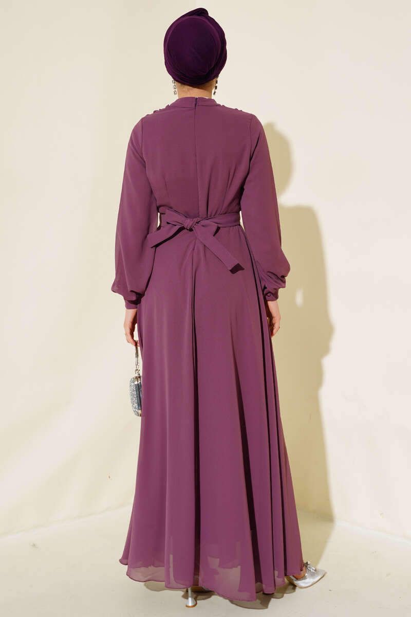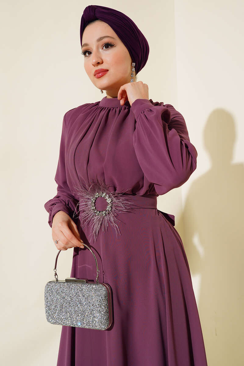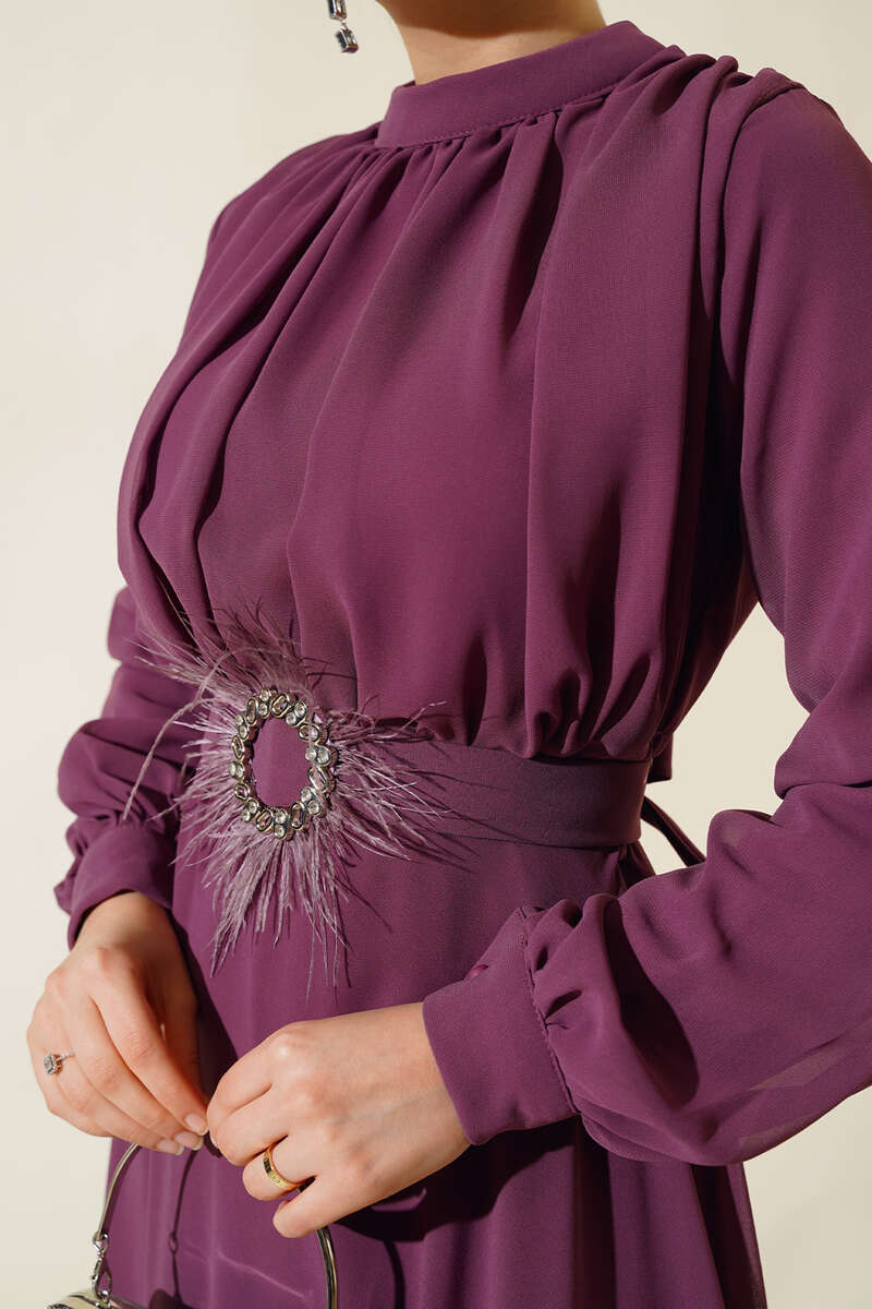 Yeni sezon şifon elbisemiz şık davetlerde ve özel gecelerde ışıldamanız için tasarlandı. Kendi renginde olan kuşağı tüy detaylıdır. Manşet bilekleri düğmelidir. Hakim yaka olan elbisemizin sırtı fermuarlıdır.