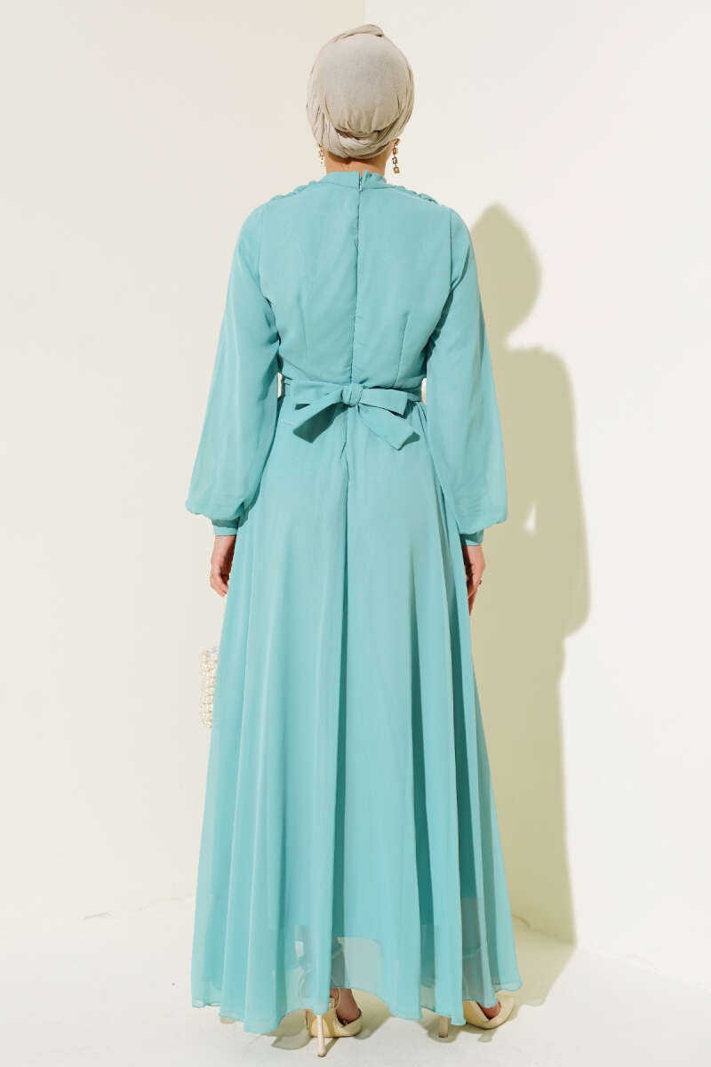 Bel Taşlı Pelerinli Abiye Elbise Kahve