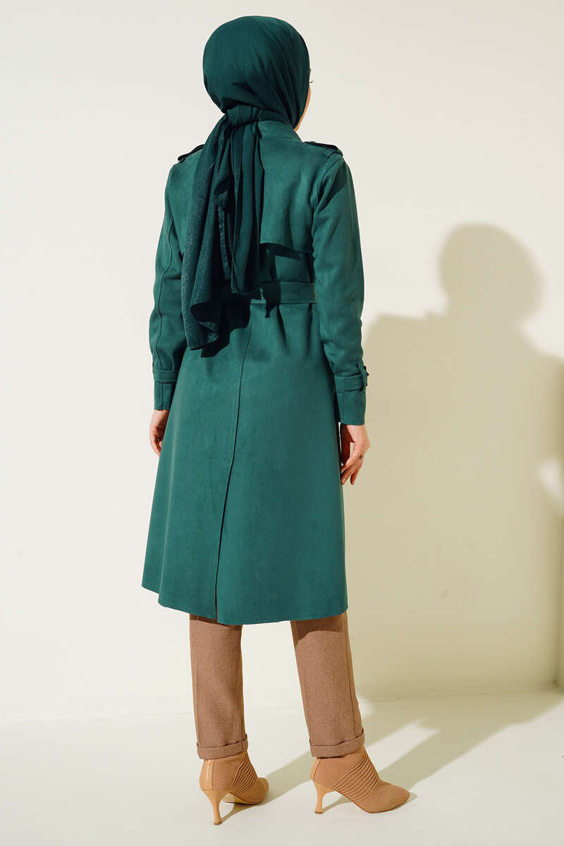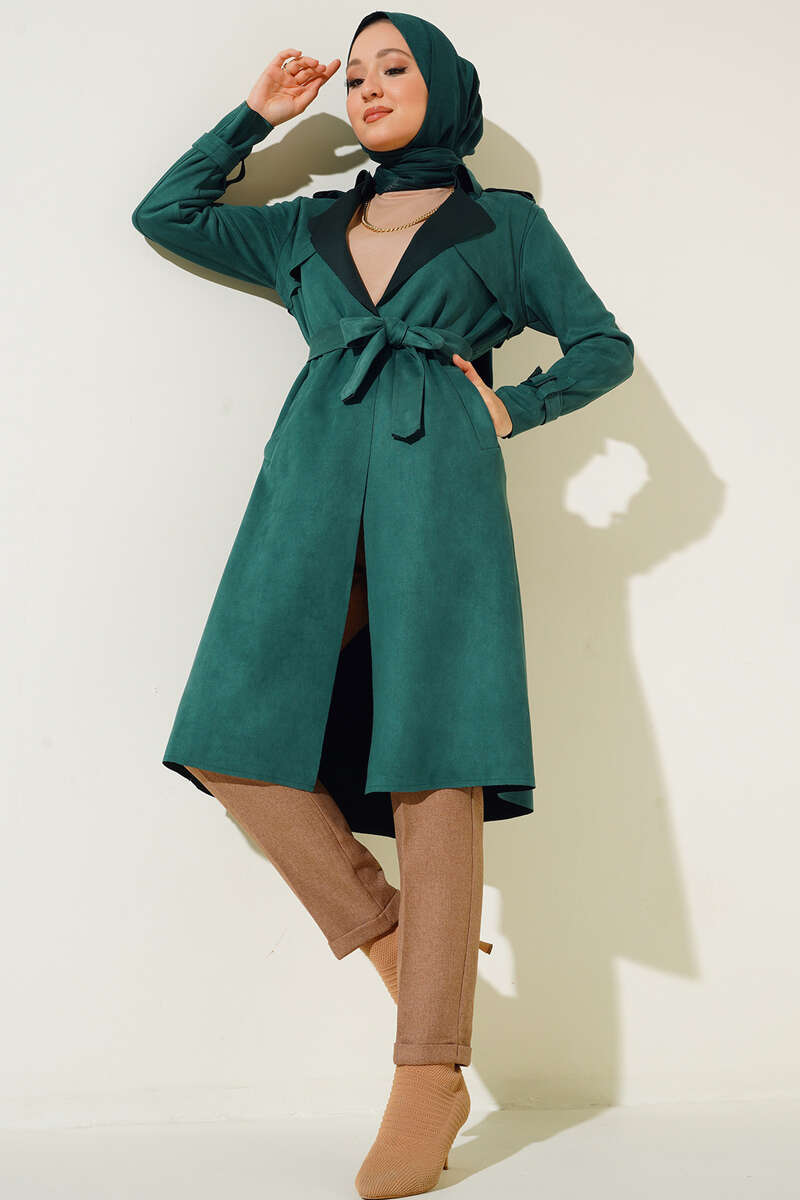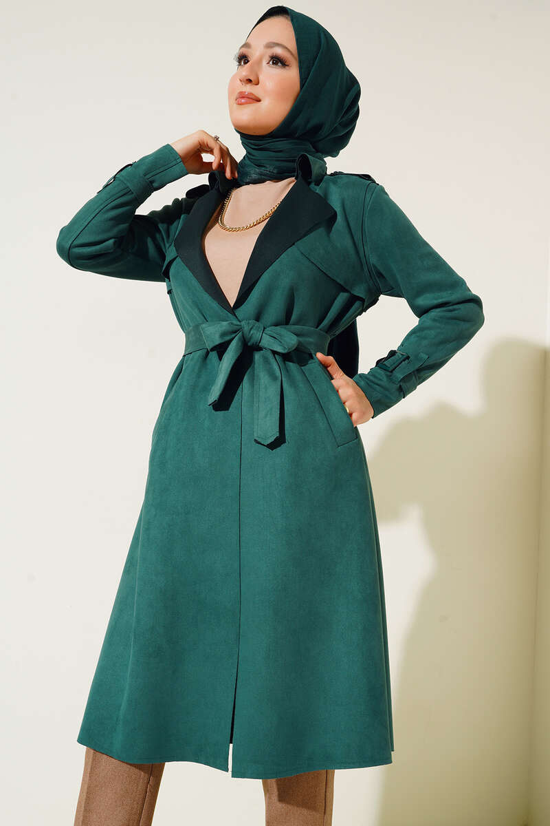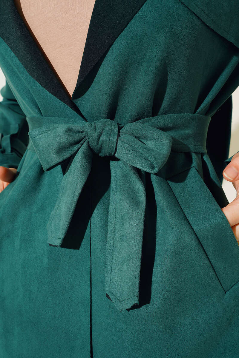 Kuşaklı Araboy Süet Trençkot Zümrüt Yeşili
