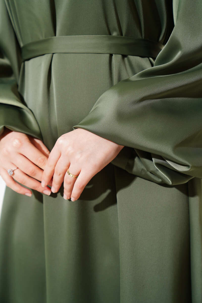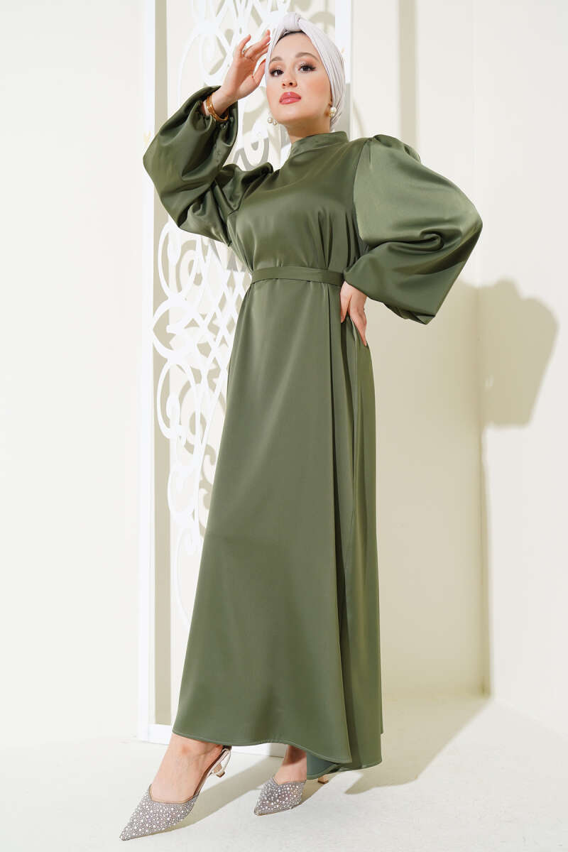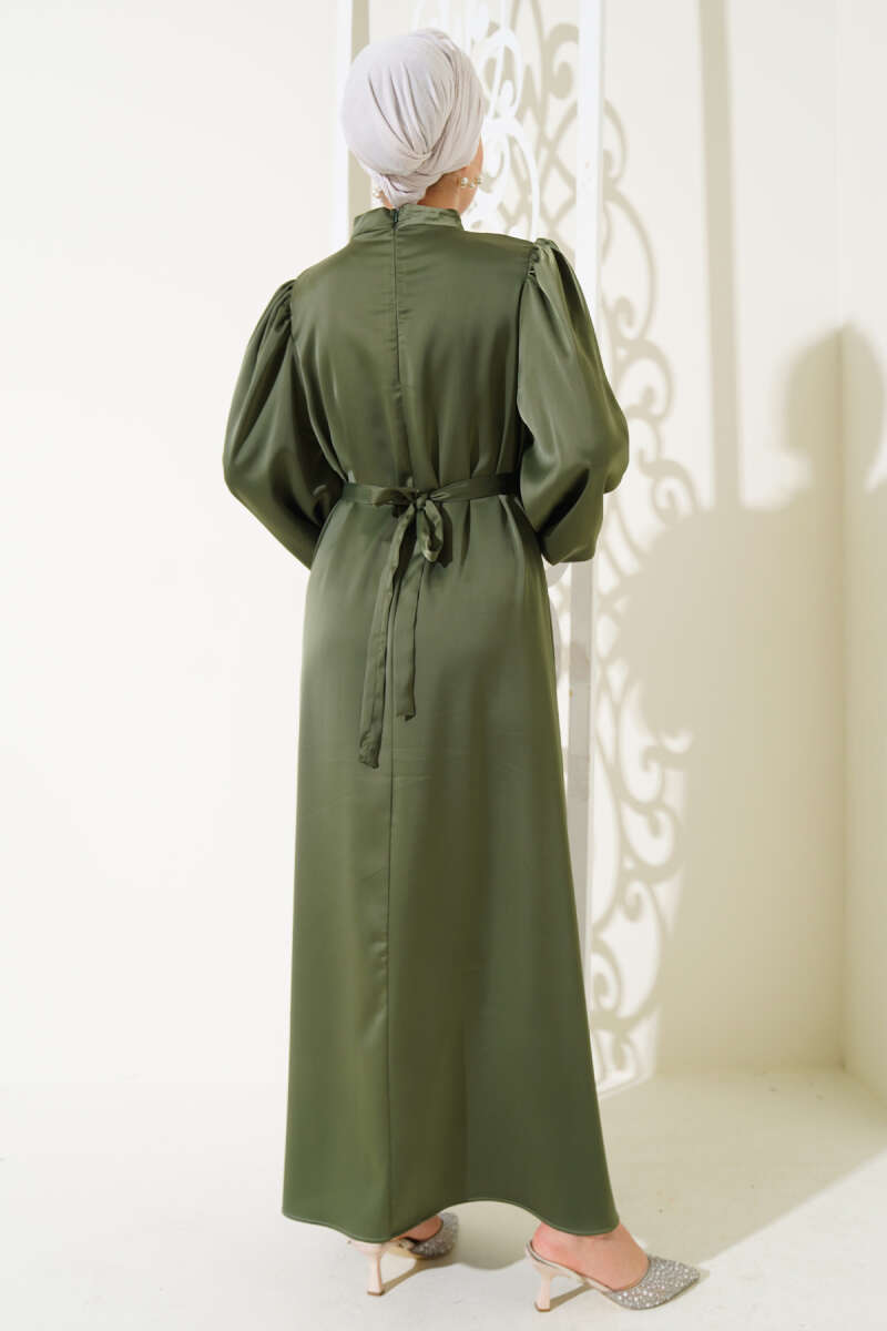 Gül Detaylı Pelerinli Abiye Elbise Haki