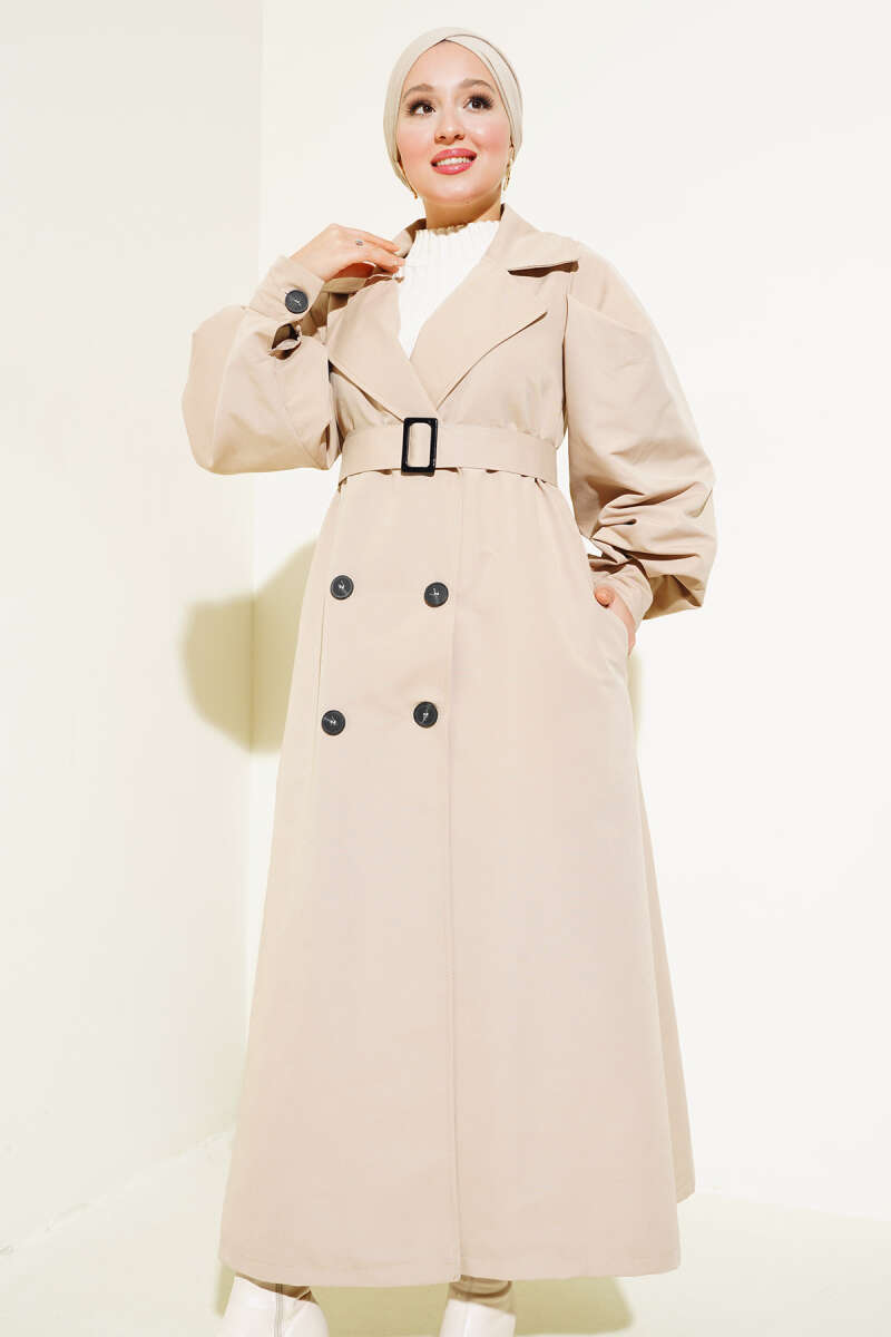 Kuşaklı Balon Kol Uzun Trençkot Bej