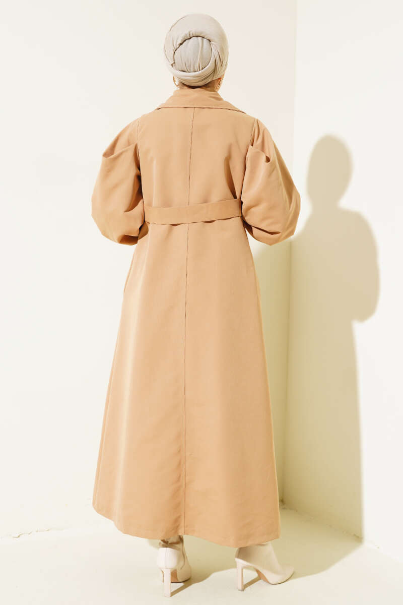 Kuşaklı Balon Kol Uzun Trençkot Camel