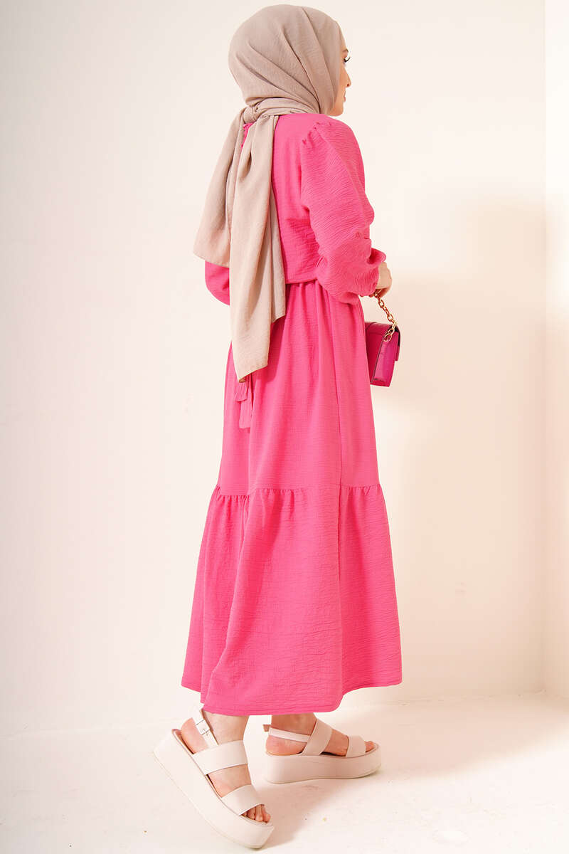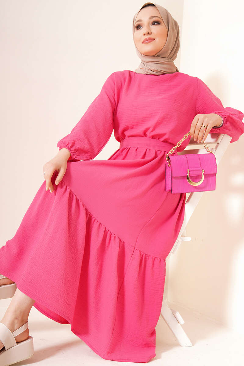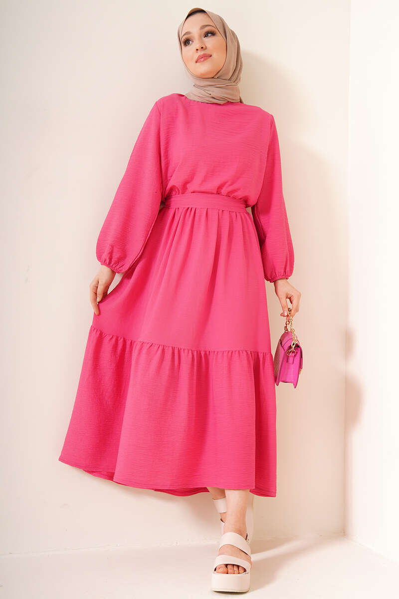 Kuşaklı Bel Lastikli Elbise Fuşya