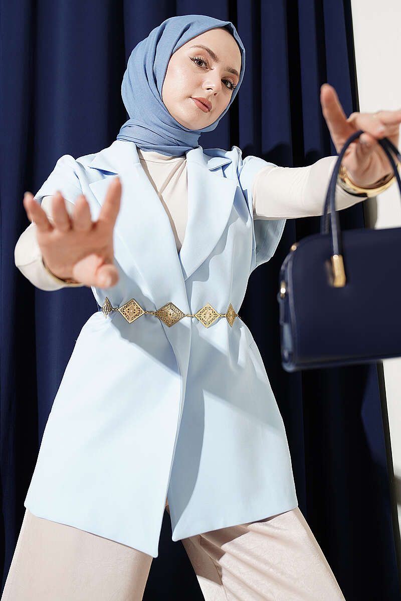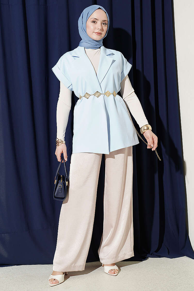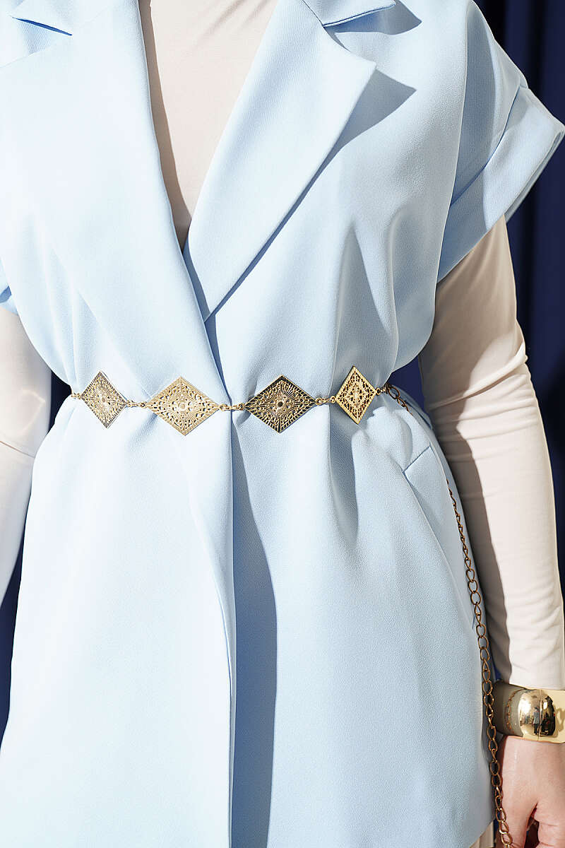 Kruvaze Yaka Kemer Detaylı Yelek Mavi
