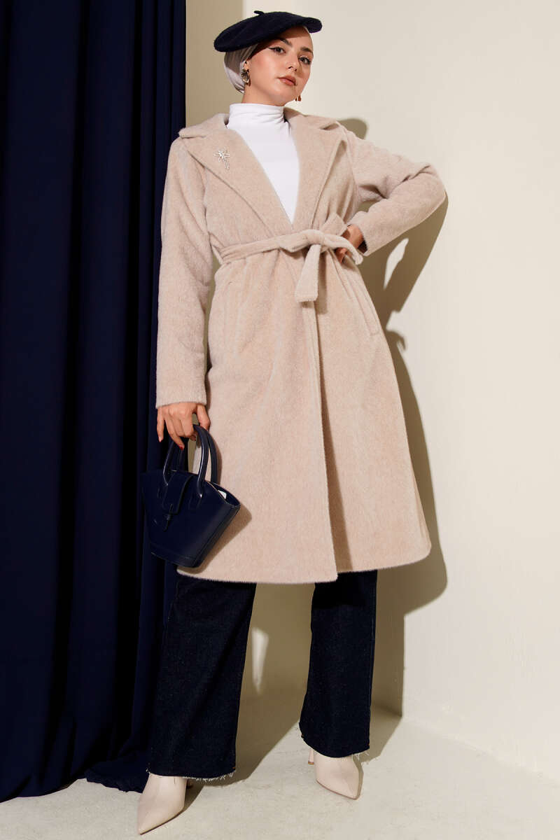 Kuşaklı Broş Detaylı Kaşe Kaban Bej