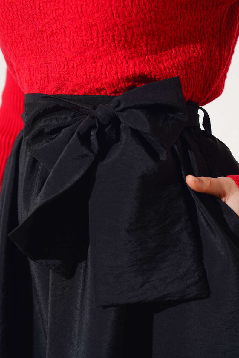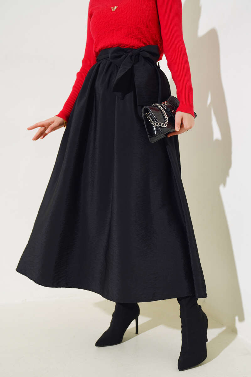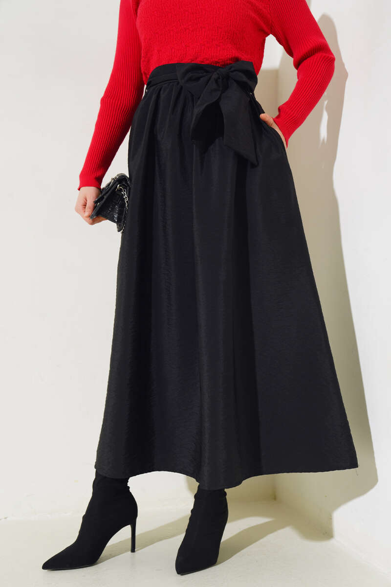 Beli Kemerli Lastikli Pileli Etek Siyah
