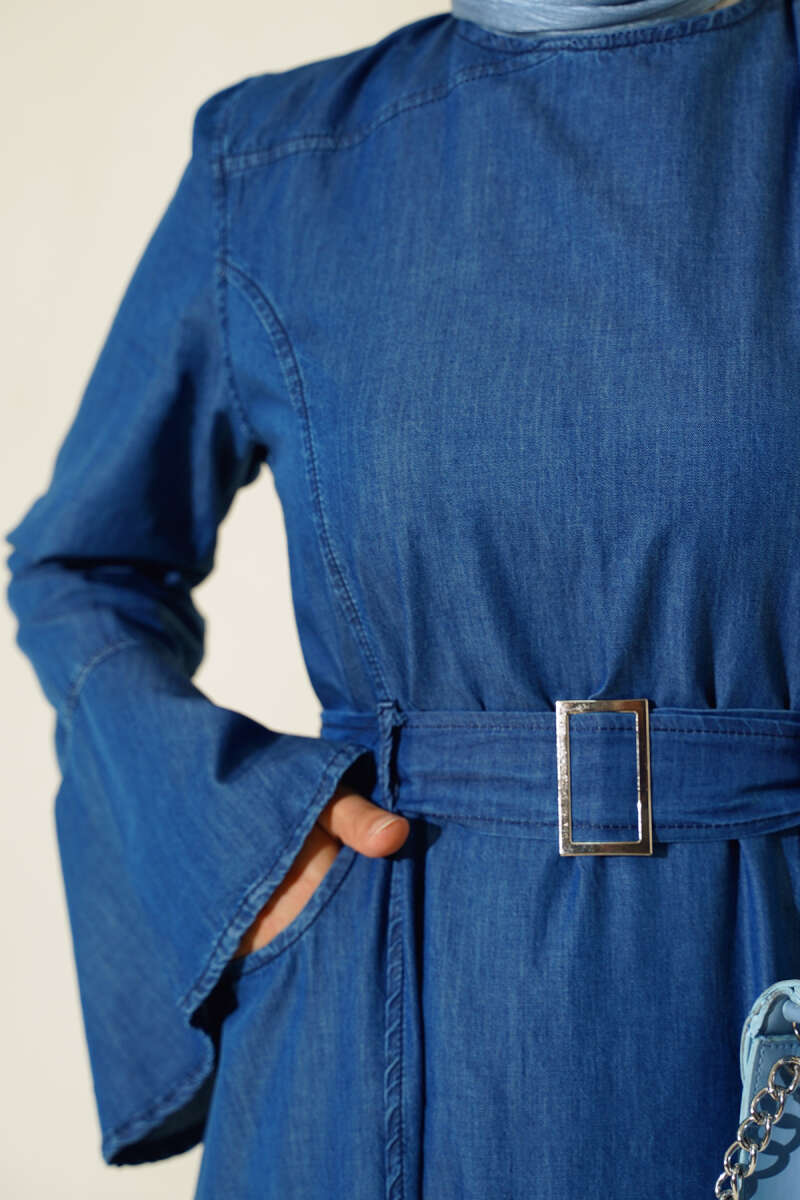 Balon Kol Kemerli Basic Elbise Lacivert