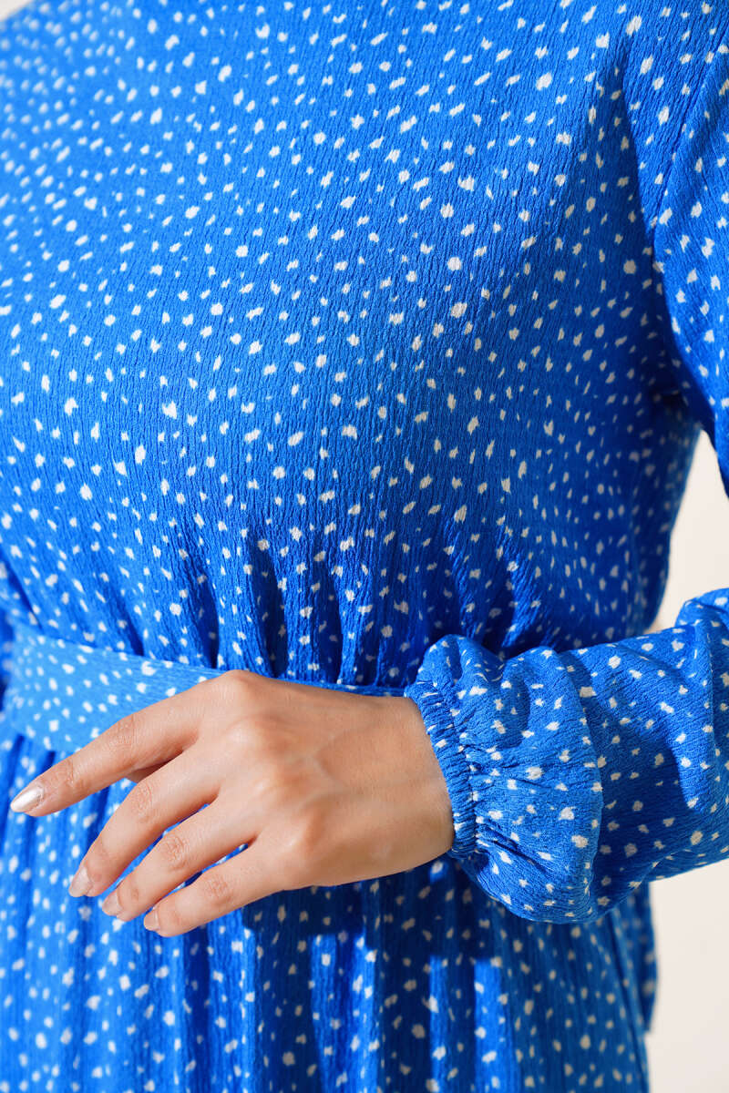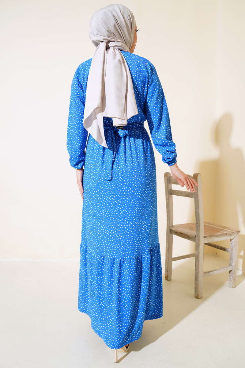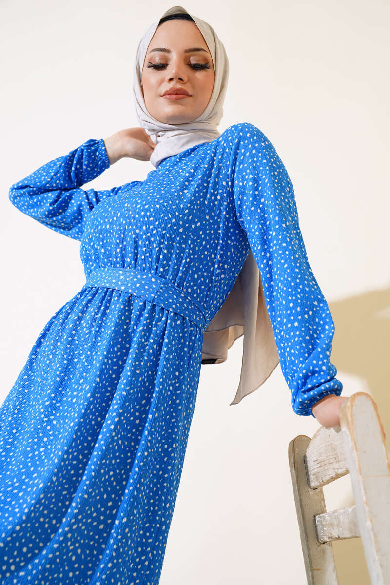 Kuşaklı Desenli Bürümcük Elbise Mavi