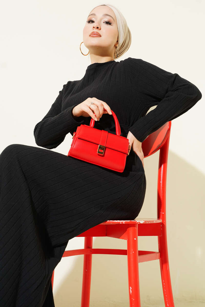 Çizgi Gömlek Garnili Triko Elbise Siyah