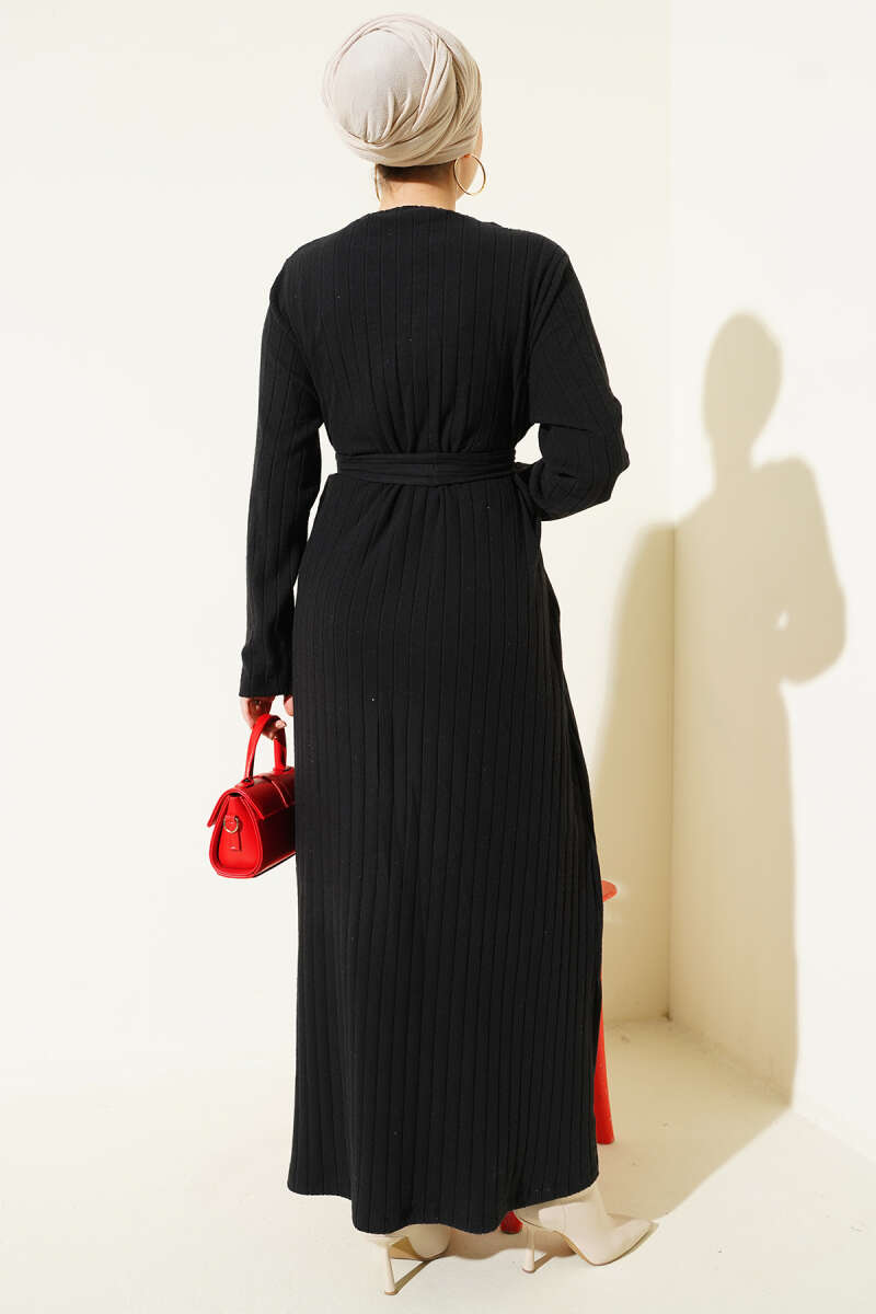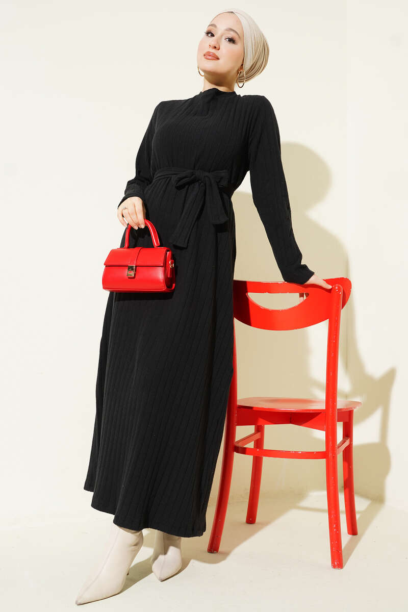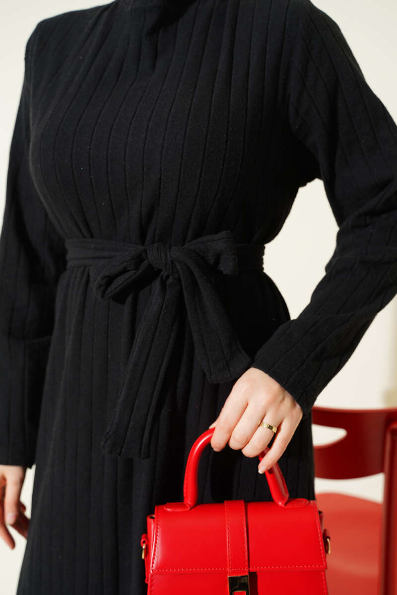 Kuşaklı Dik Fitilli Kaşe Elbise Siyah