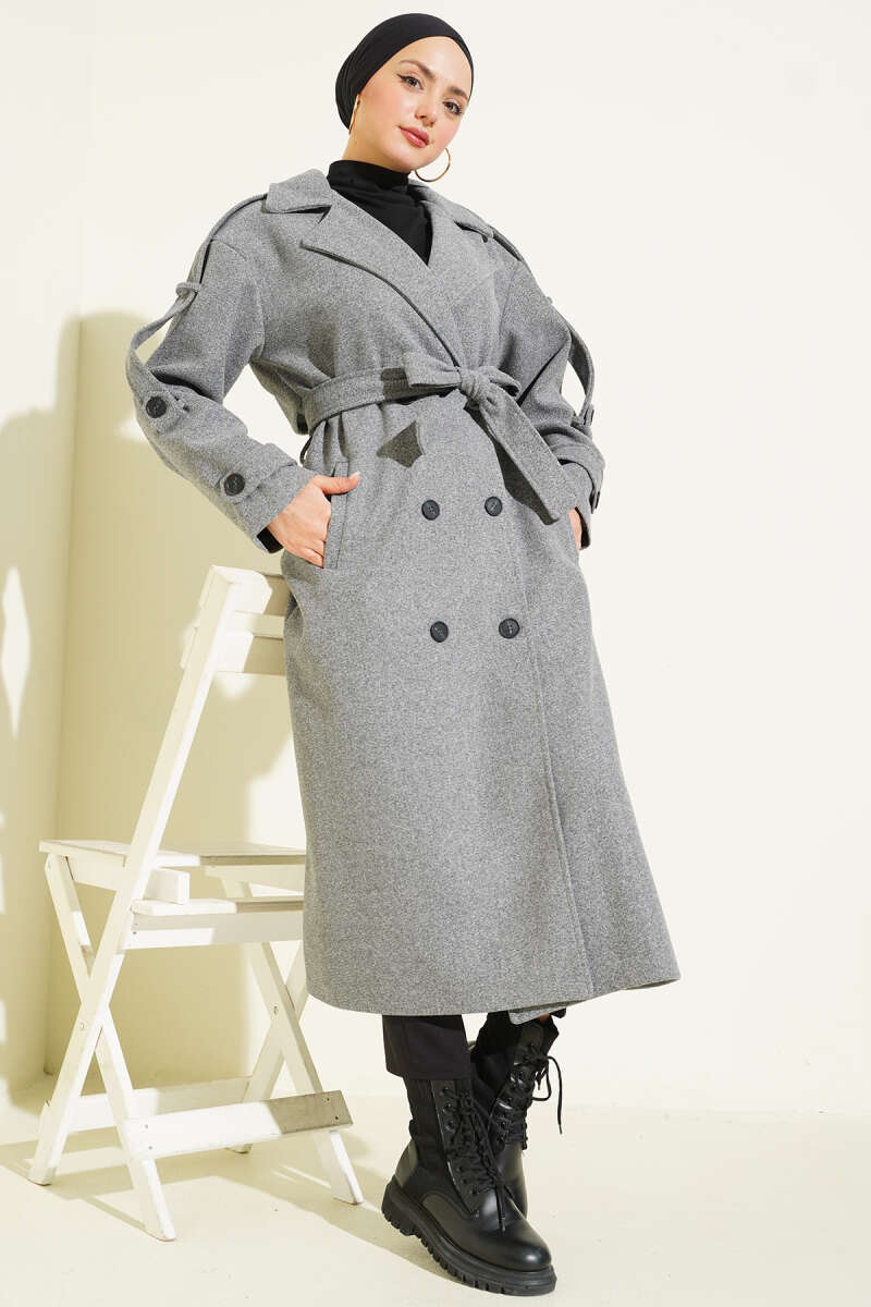 Kuşaklı Bronş Detaylı Kaşe Kaban Füme