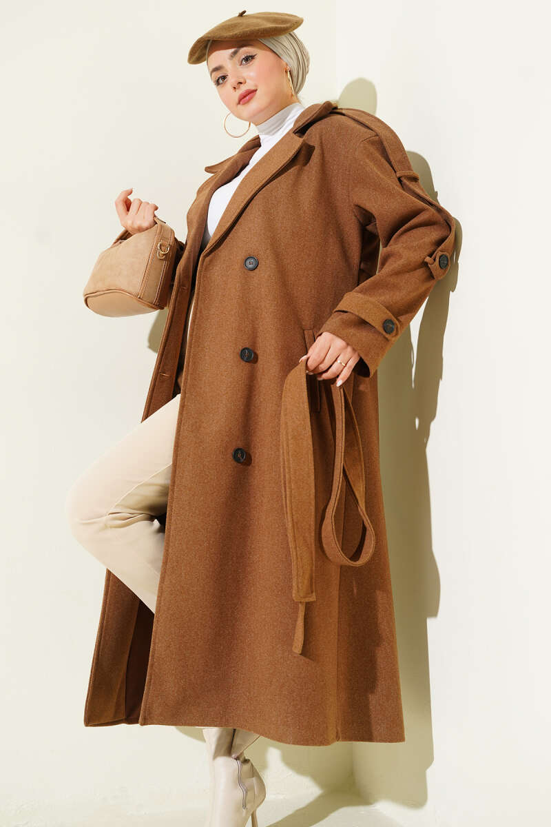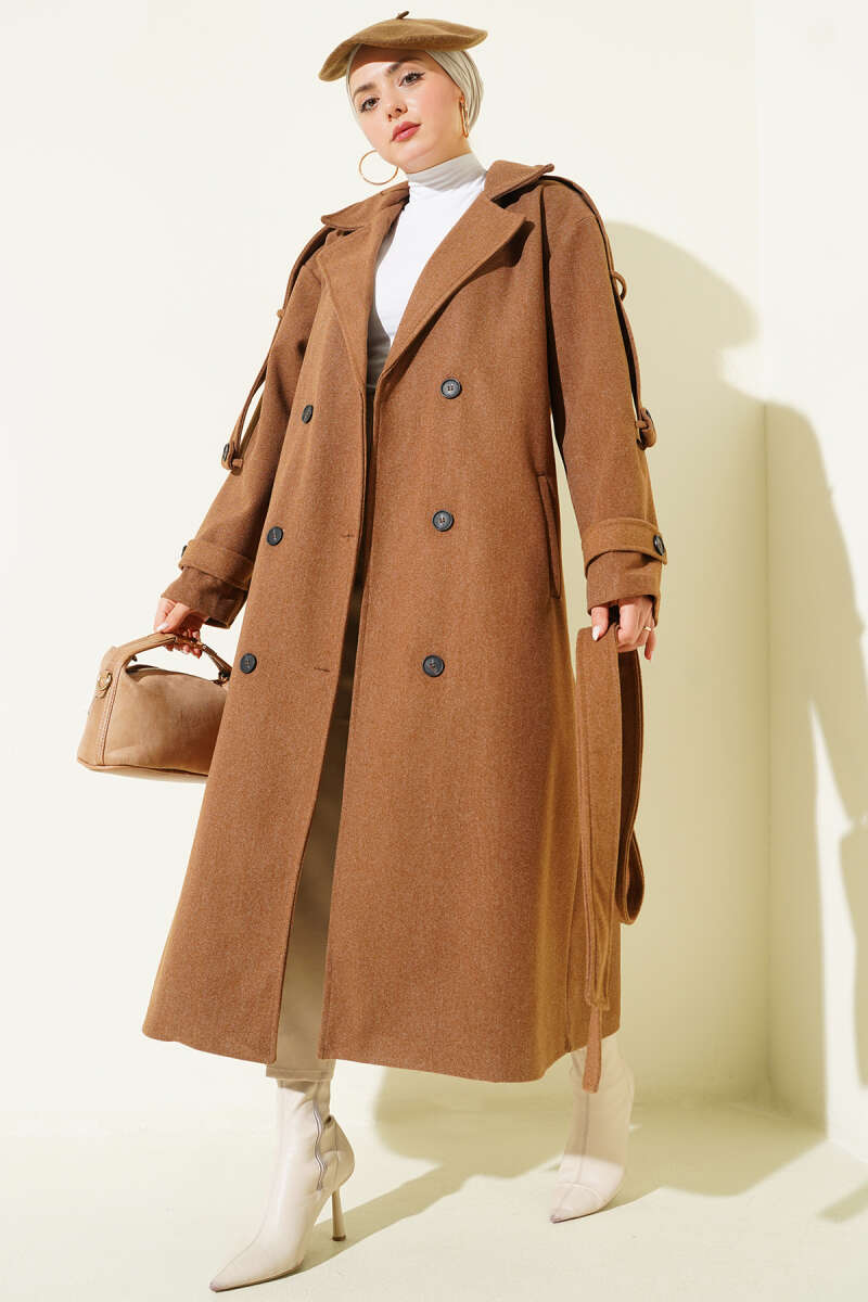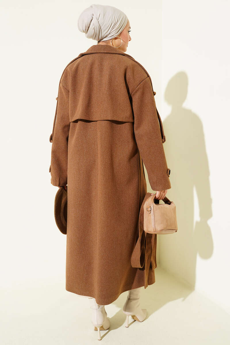 Kuşaklı Bronş Detaylı Kaşe Kaban Acı Kahve
