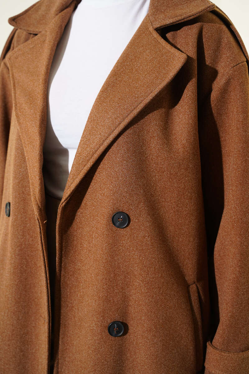 Omuz Apoletli Düğme Detaylı Kaşe Kaban Taba