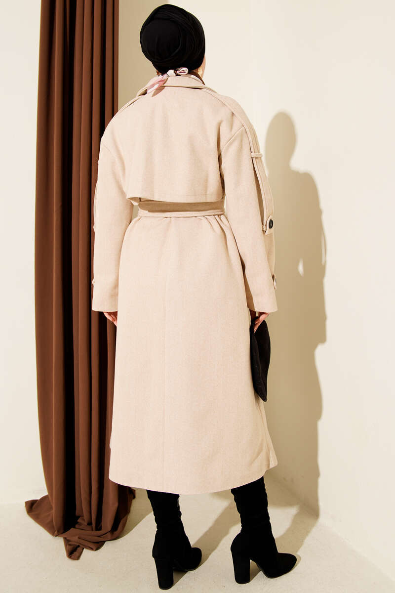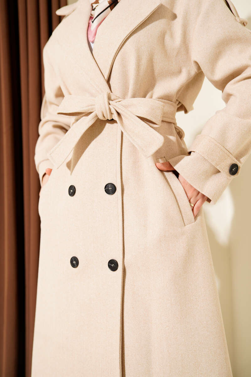 Kuşaklı Düğmeli Kaşe Kaban Bej