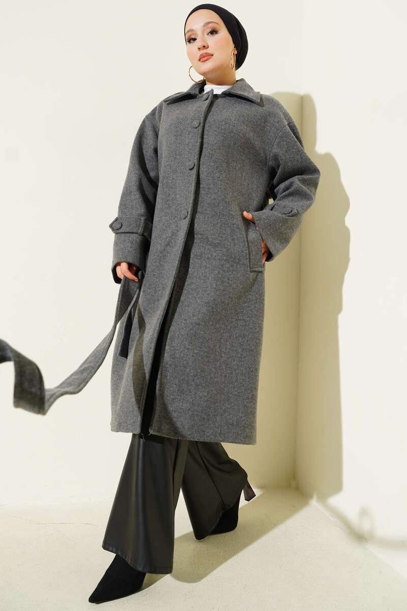 Kuşaklı Kruvaze Yaka Kısa Kaşe Kaban Gri