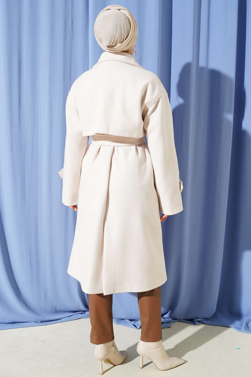 Kuşaklı Kruvaze Yaka Kısa Kaşe Kaban Ekru