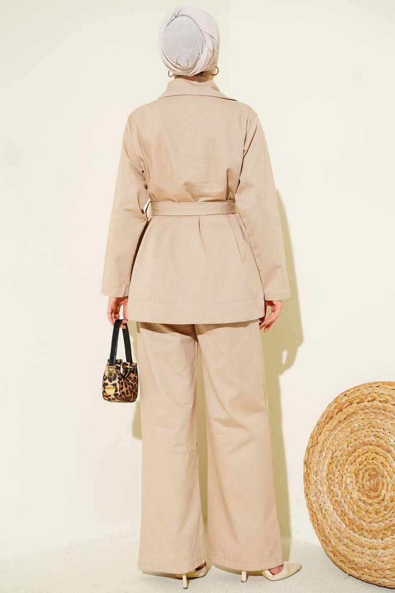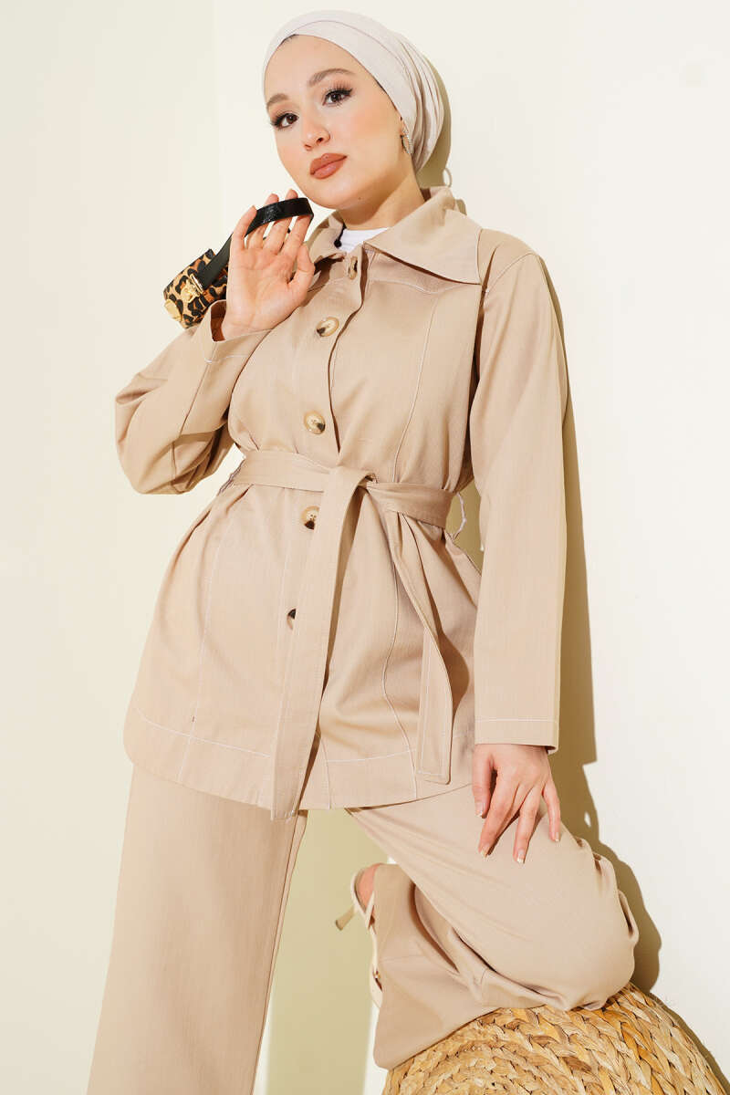 Kuşaklı Düğmeli Kot İkili Takım Haki