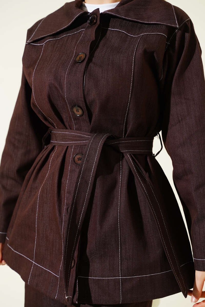 Kuşaklı Düğmeli Kot İkili Takım Kahve