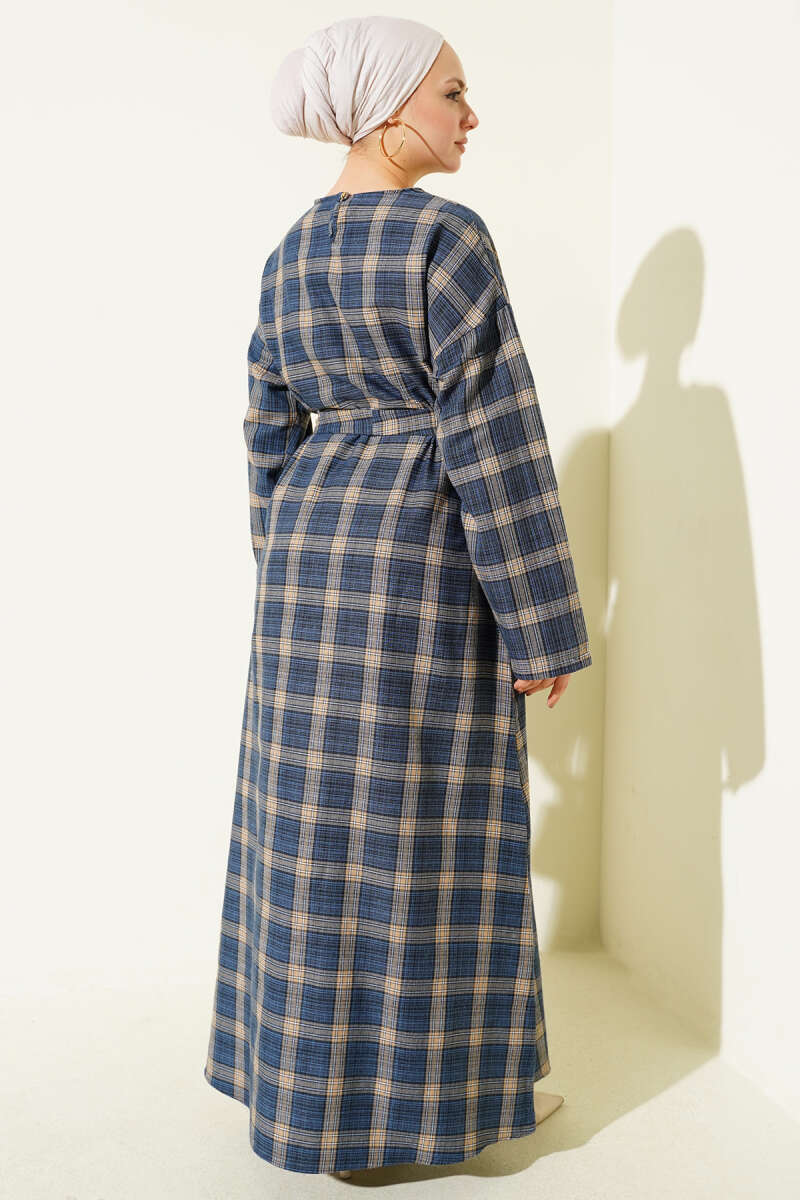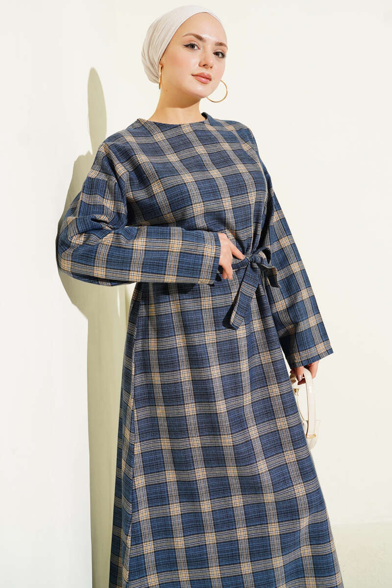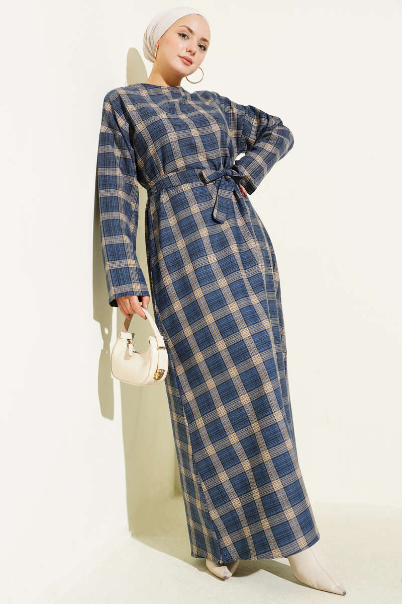 Kuşaklı Ekose Desenli Kloş Elbise Lacivert