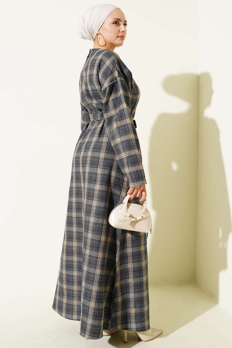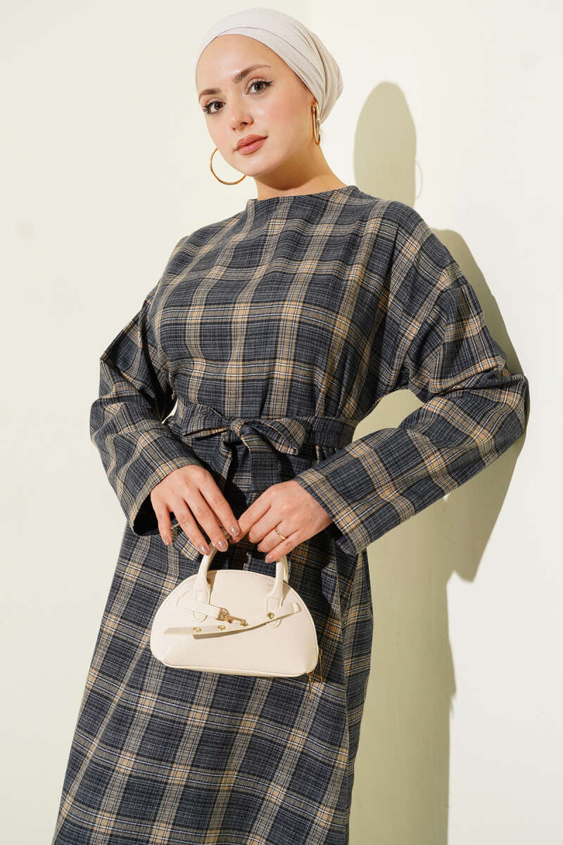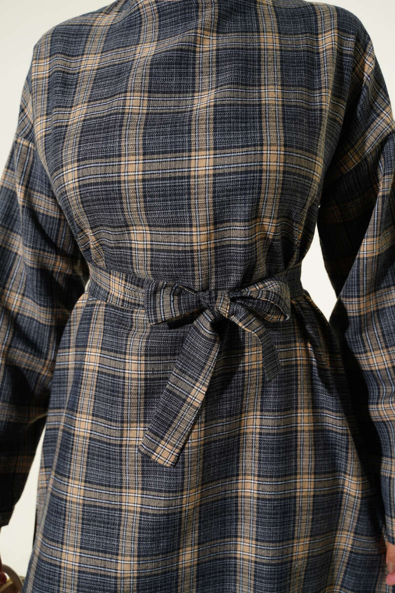 Kuşaklı Ekose Desenli Kloş Elbise İndigo